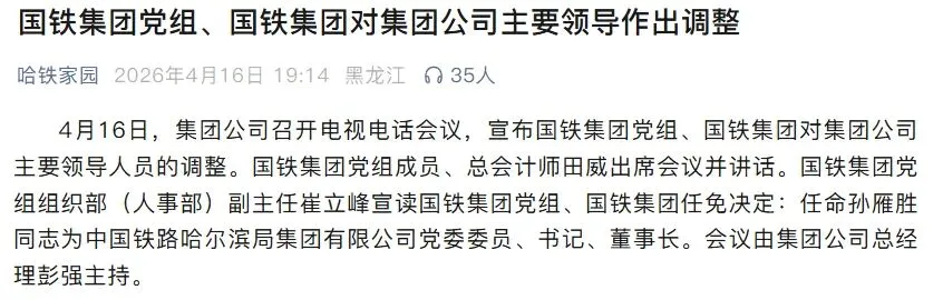 2026年4月16日,集团公司召开电视电话会议,宣布国铁集团党组、国铁集团对中国铁路哈尔滨局集团有限公司主要领导人员的调整。国铁集团党组成员、总会计师田威出席会议并讲话。国铁集团党组组织部(人事部)副主任崔立峰宣读国铁集团党组、国铁集团任免决定:任命孙雁胜同志为中国铁路哈尔滨局集团有限公司党委委员、书记、董事长。
