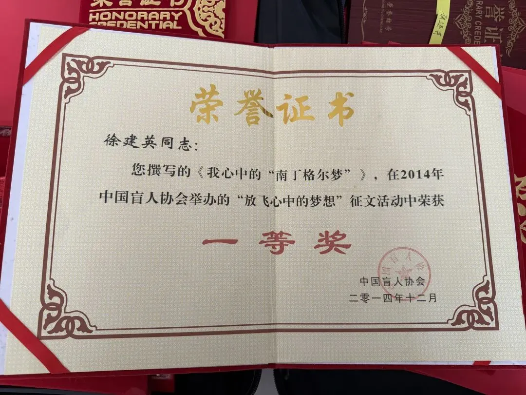 “我愿意做有梦想的人,为了心中一个哪怕永远也实现不了的梦,我将无怨无悔地前行……”这是徐建英在《我心中的“南丁格尔梦”》一文中写下的话。这篇文章是一篇2000余字的散文,构思、写作加修改用了两个月。该作品在2014年中国盲人协会举办的征文活动中获得一等奖。“第一次投稿就得到这么高的荣耀,特别鼓舞我。当时还得到了几百元的奖金,我都不舍得花。”徐建英笑着说。