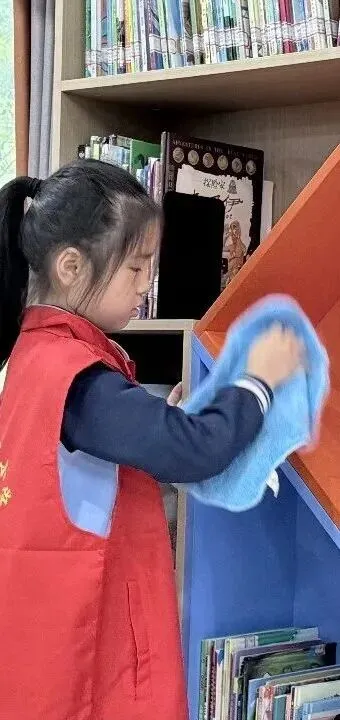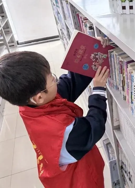 启动仪式后,志愿者分为两组开展重点志愿服务:图书整理与清洁组在借阅区分类归置散乱图书、擦拭图书及书架灰尘并登记破损情况;经典推荐组向读者尤其是青少年赠送四大名著读书推荐卡,讲解书籍亮点、引导经典阅读。