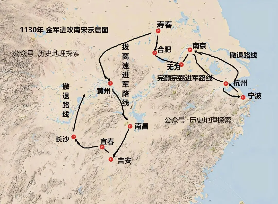 东路,金军主力由完颜宗弼(兀术)率领,攻占庐州(合肥),和州,在今安徽无为的马家渡击败岳飞,然后经过广德、安吉,直扑临安,目的就是抓住赵构。