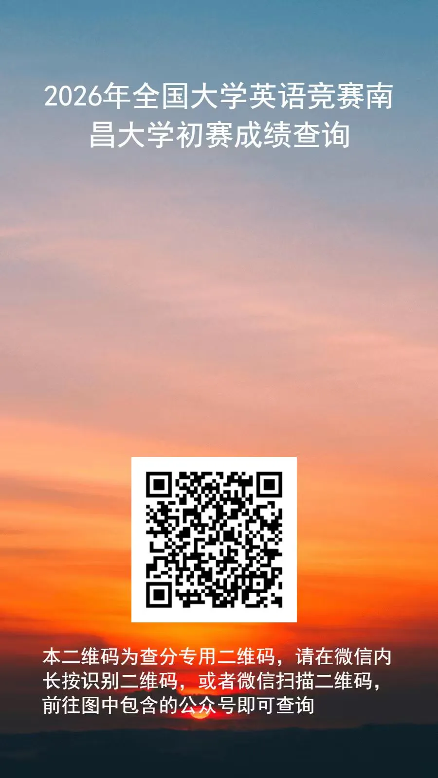 各位同学,2026年全国大学生英语竞赛南昌大学初赛已经落下帷幕,现公布初赛成绩,请大家通过下方链接或者二维码查询。