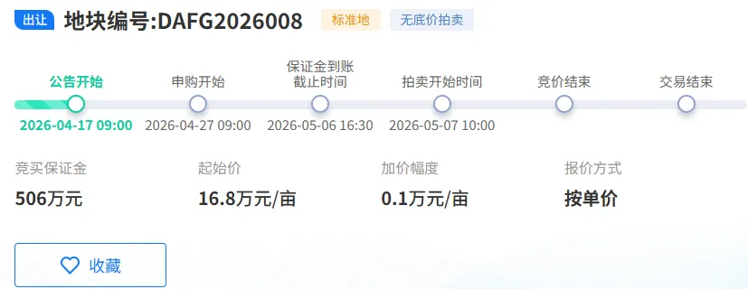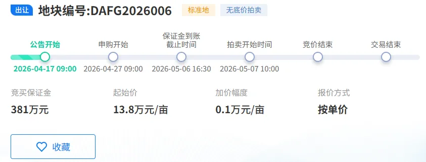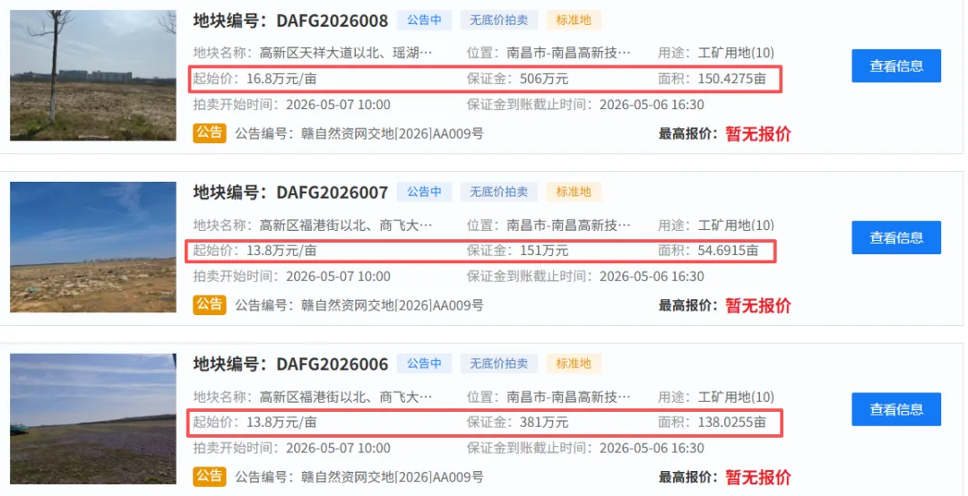 宗地编号:DAFG2026006、DAFG2026007两宗地块紧密相连,地处商飞江西飞机制造有限公司北侧、瑶湖机场跑道西侧,坐拥航空产业核心区位,总面积合计 192.717 亩。主打航空制造核心赛道,重点发展国产民机衍生型号研发、改装及配套产业,项目总投资 10 亿元。依托瑶湖机场资源与本地航空产业链基础,进一步补齐航空产业短板、完善产业生态,同时在研发投入、能耗排放、投资强度等方面设定严格指标,保障高端产业高质量发展。不同于普通工业用地,本次 3 宗产业地块全部实行标准化管控,从投资强度、税收贡献、建设周期、环保能耗等多维度设立硬性要求。坚持 “拿地即开工” 改革导向,依托标准地出让模式,压缩审批时限、优化营商环境;同时严格约束开发建设节奏,杜绝土地闲置、低效用地,最大化释放产业土地价值。从产业布局来看,航空制造属于南昌高新区支柱核心产业,无人机、智能机器人更是当下低空经济、高端装备制造的风口赛道。本次 25 亿重大产业项目集中落地,既是高新区深耕实体经济、做强先进制造的关键举措,也是抢抓低空经济发展机遇、培育新质生产力的重要布局。关注我们,第一时间了解 5 月 7 日土拍盛况,抢先揭晓哪些优质企业正式落址南昌高新!