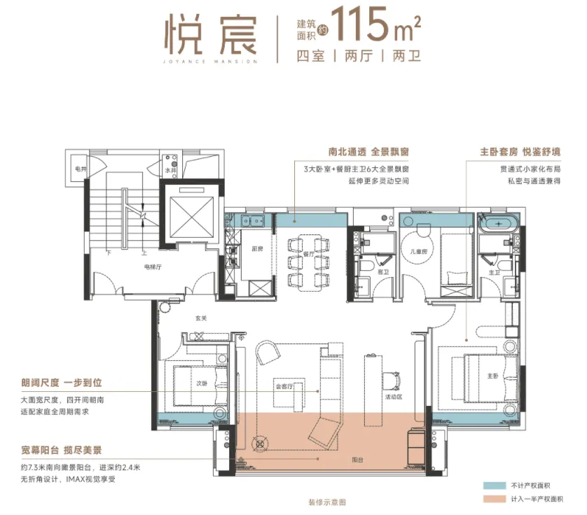 ·新规高使用率:通过全尺寸飘窗、新规阳台使用拉满等拓展面积,每一寸都不浪费。就像这个洋房115平米的户型,6个全尺寸飘窗全部用满,直接将使用率拉满。