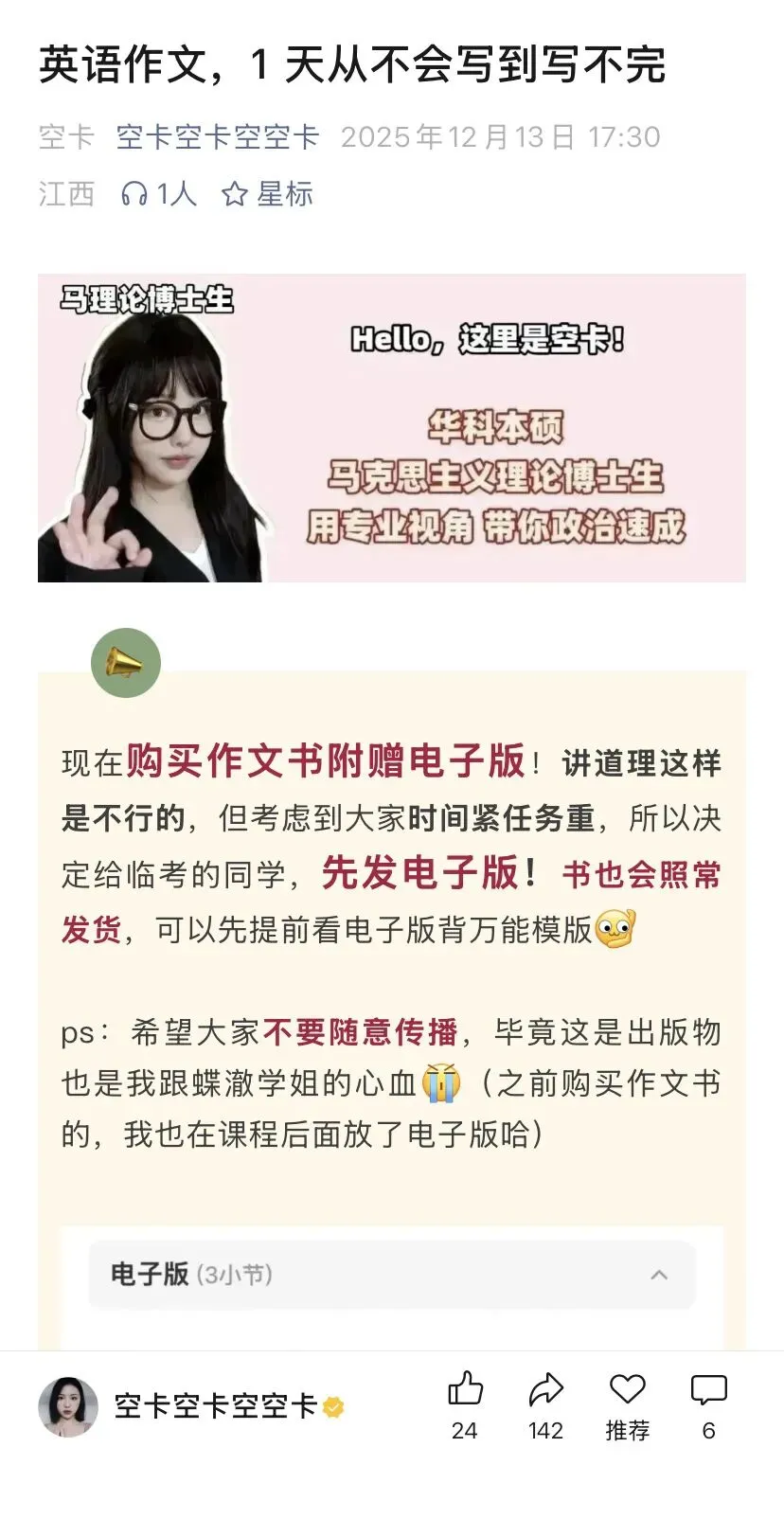 张老师的课程非常的简明扼要,通过往年真题拆解题目、结构、开头、结尾的写法,会手把手教你如何在完全下不了笔的情况下找到破题点,写出能拿到7成分数的文章。