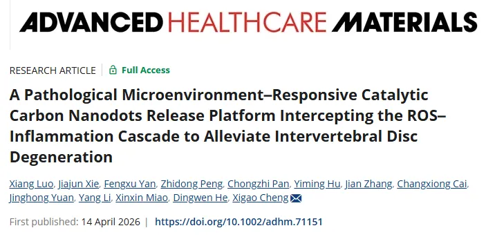 Xiang Luo, Jiajun Xie, Fengxu Yan, Zhidong Peng, Chongzhi Pan, Yiming Hu, Jian Zhang, Changxiong Cai, Jinghong Yuan, Yang Li, Xinxin Miao, Dingwen He, Xigao Cheng. A Pathological Microenvironment–Responsive Catalytic Carbon Nanodots Release Platform Intercepting the ROS–Inflammation Cascade to Alleviate Intervertebral Disc Degeneration. Advanced Healthcare Materials (2026): e71151.