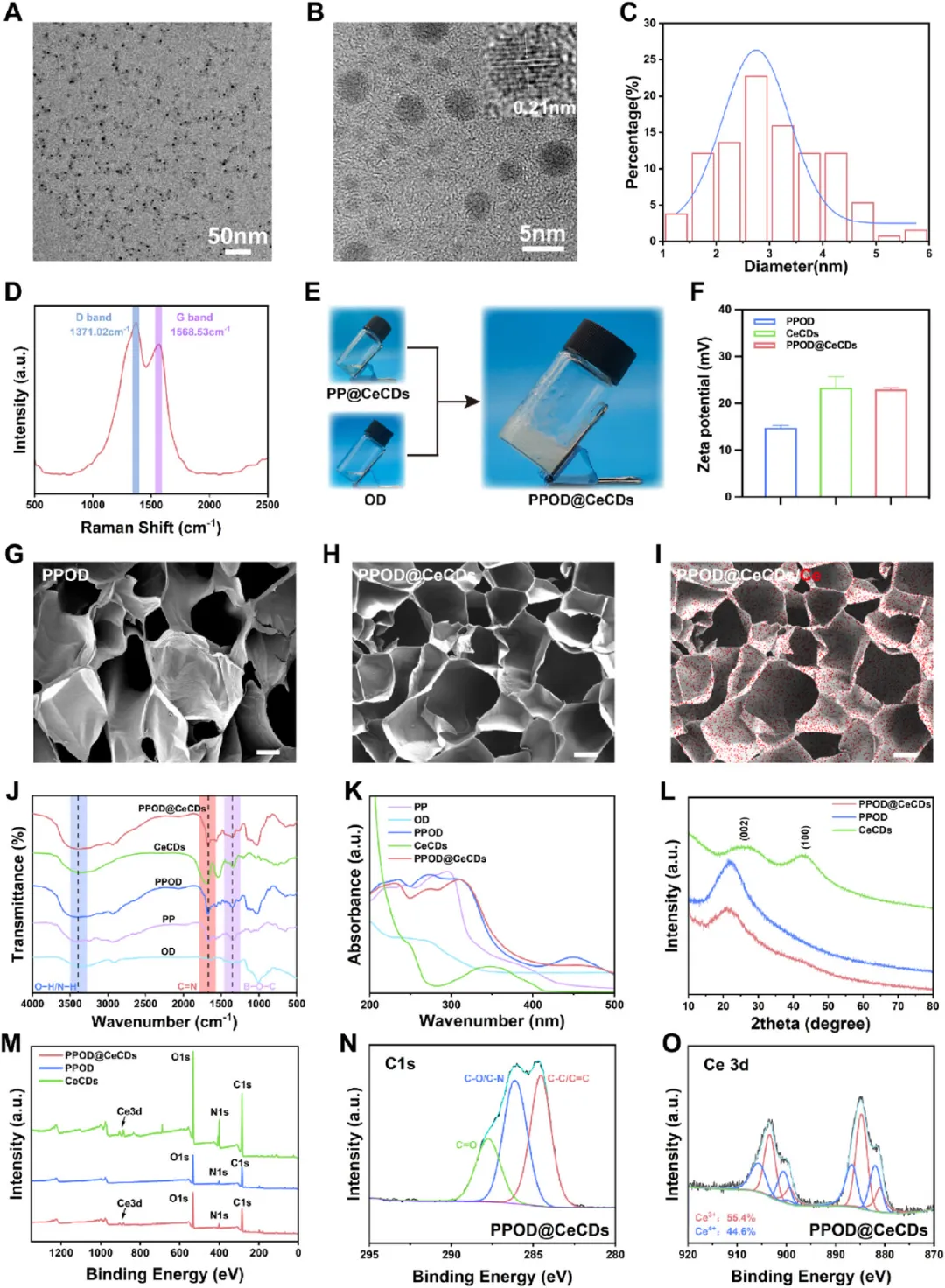 PPOD@CeCDs通过PP与OD的苯硼酸酯键和席夫碱键动态交联形成,SEM显示其具有均匀多孔三维网络,CeCDs均匀分散其中;FT-IR、XRD及XPS证实两种动态共价键共存,Ce以Ce³⁺(55.4%)和Ce⁴⁺(44.6%)混合价态稳定存在。