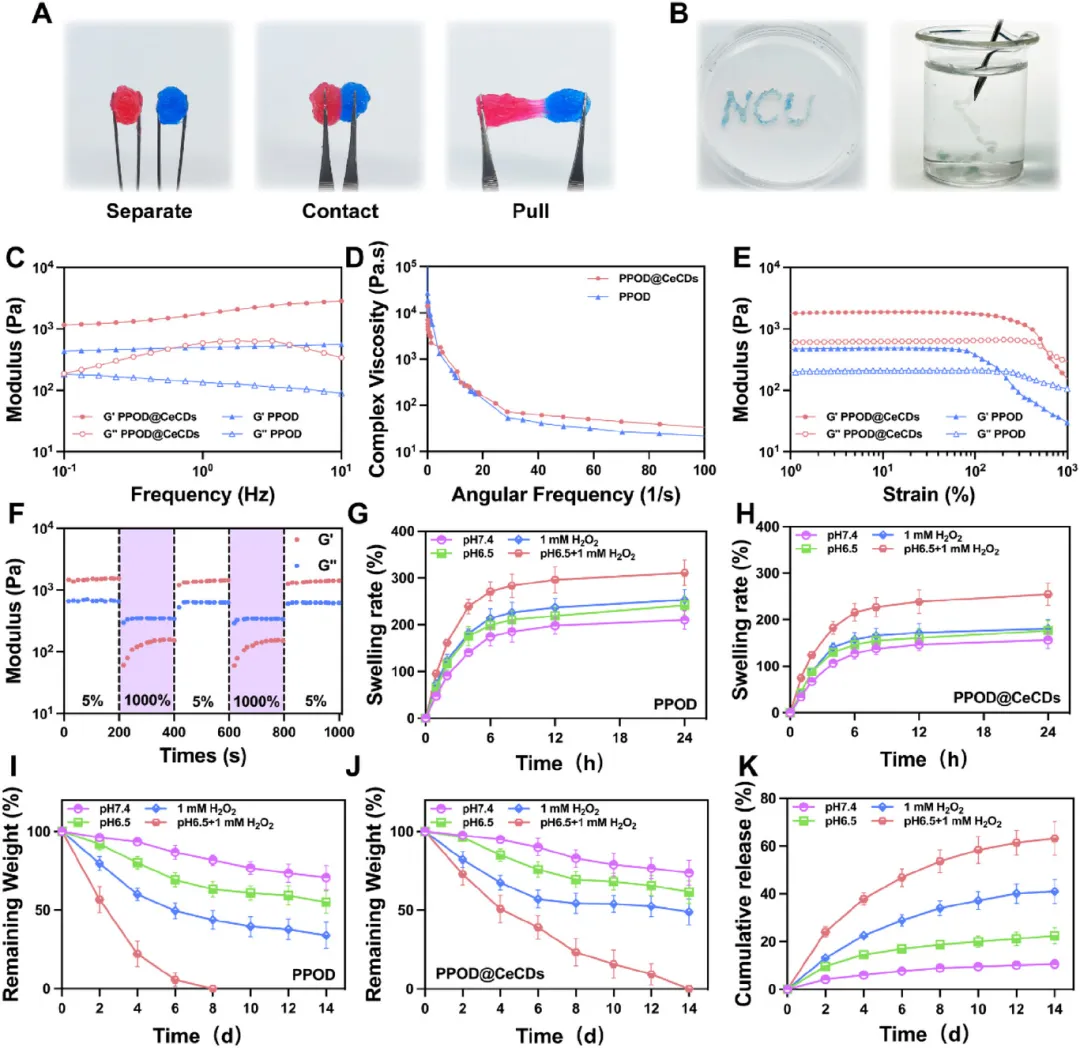 PPOD@CeCDs水凝胶性能 该水凝胶具有优良自修复性和可注射性,挤压后可快速原位成型;流变学测试显示,其储能模量(G′)始终高于损耗模量(G″),负载CeCDs后网络更强,且保留剪切变稀特性和抗疲劳性。
