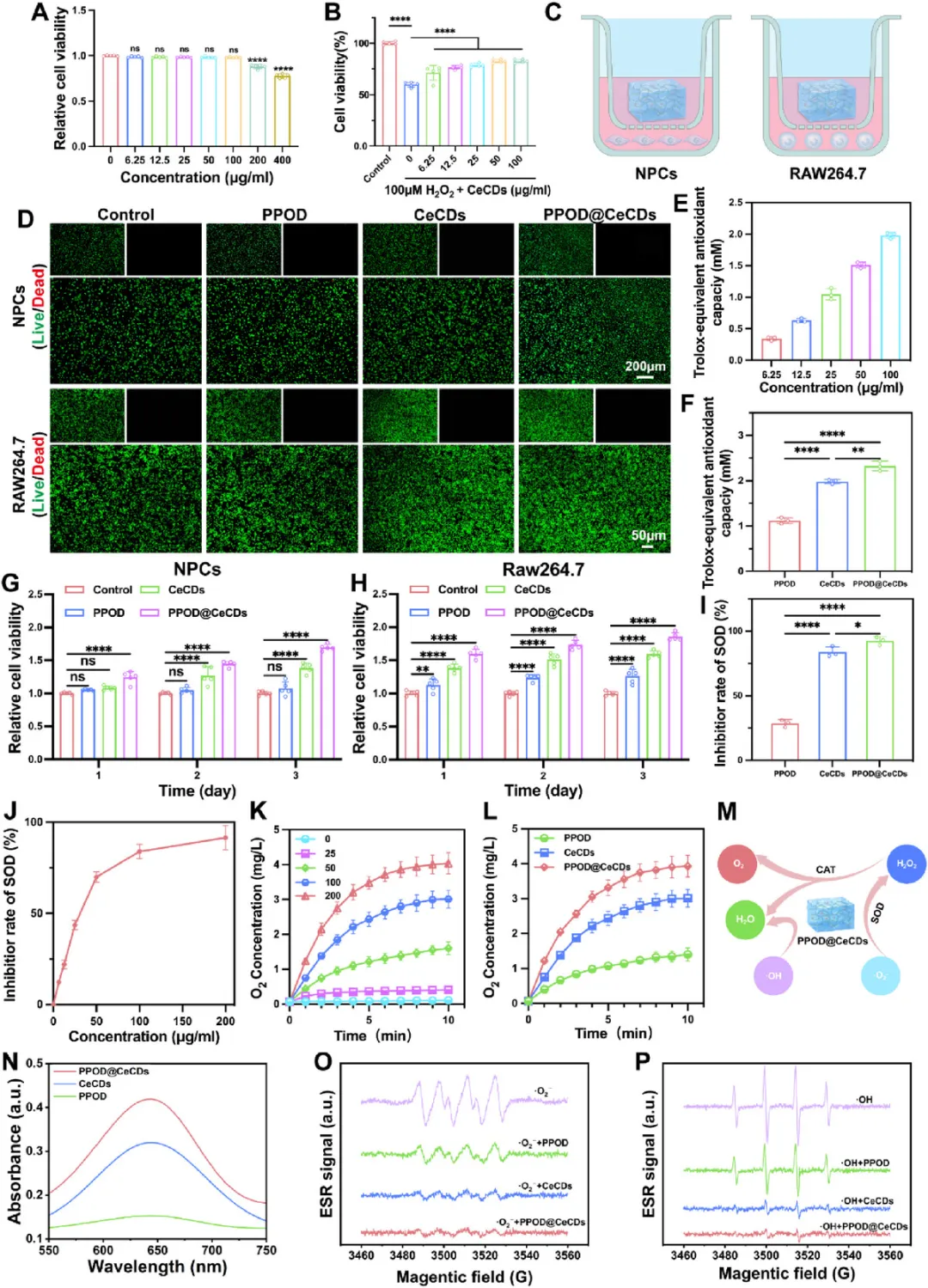 生物相容性与酶促活性 CeCDs在≤100 μg/mL浓度下对NP细胞无细胞毒性,100 μg/mL时对100 μM H₂O₂诱导的细胞损伤保护效果最佳。PPOD@CeCDs与NP细胞、RAW264.7巨噬细胞共培养48h,细胞存活率维持在高水平,生物相容性优良。