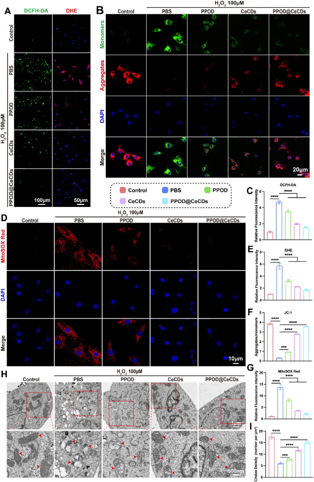 线粒体保护与ROS清除 100 μM H₂O₂诱导NP细胞ROS大量积累,PPOD@CeCDs可显著降低细胞总ROS和超氧阴离子水平;JC-1染色显示其可有效维持线粒体膜电位,抑制线粒体ROS爆发;TEM观察证实,其能最大程度保护线粒体结构完整,恢复嵴密度,切断线粒体损伤-ROS放大的正反馈循环。