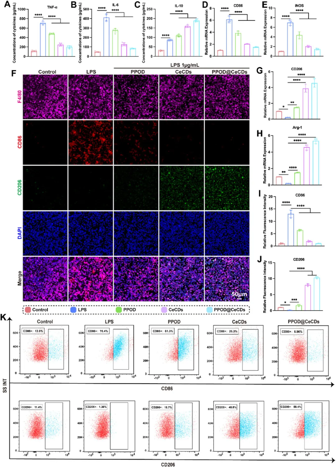 巨噬细胞极化调控 LPS(1 μg/mL)诱导RAW264.7巨噬细胞M1极化,PPOD@CeCDs可显著降低TNF-α、IL-6水平,升高IL-10水平;下调M1标志物CD86、iNOS,上调M2标志物CD206、Arg-1;流式细胞术显示,其可将CD86⁺细胞比例降至6.96%,CD206⁺细胞比例升至58.4%,高效诱导巨噬细胞向M2修复型极化。