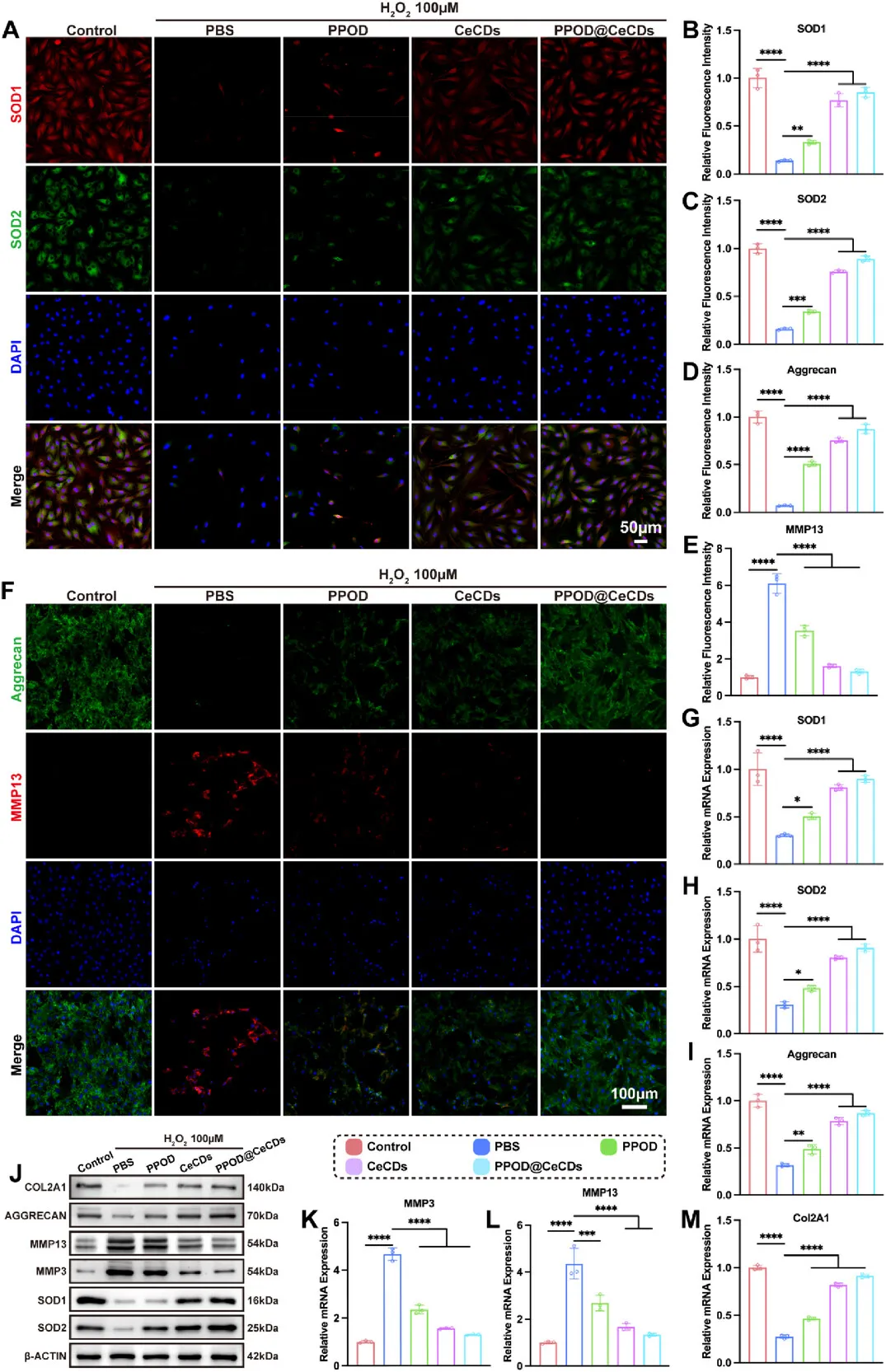 NP细胞微环境稳态重塑 H₂O₂诱导下,NP细胞SOD1、SOD2表达显著下调,Aggrecan、Col2a1表达降低,MMP3、MMP13表达升高;PPOD@CeCDs可完全恢复SOD1、SOD2表达,显著提升Aggrecan、Col2a1水平,抑制MMP3、MMP13过度表达,有效逆转基质代谢失衡,恢复细胞稳态。