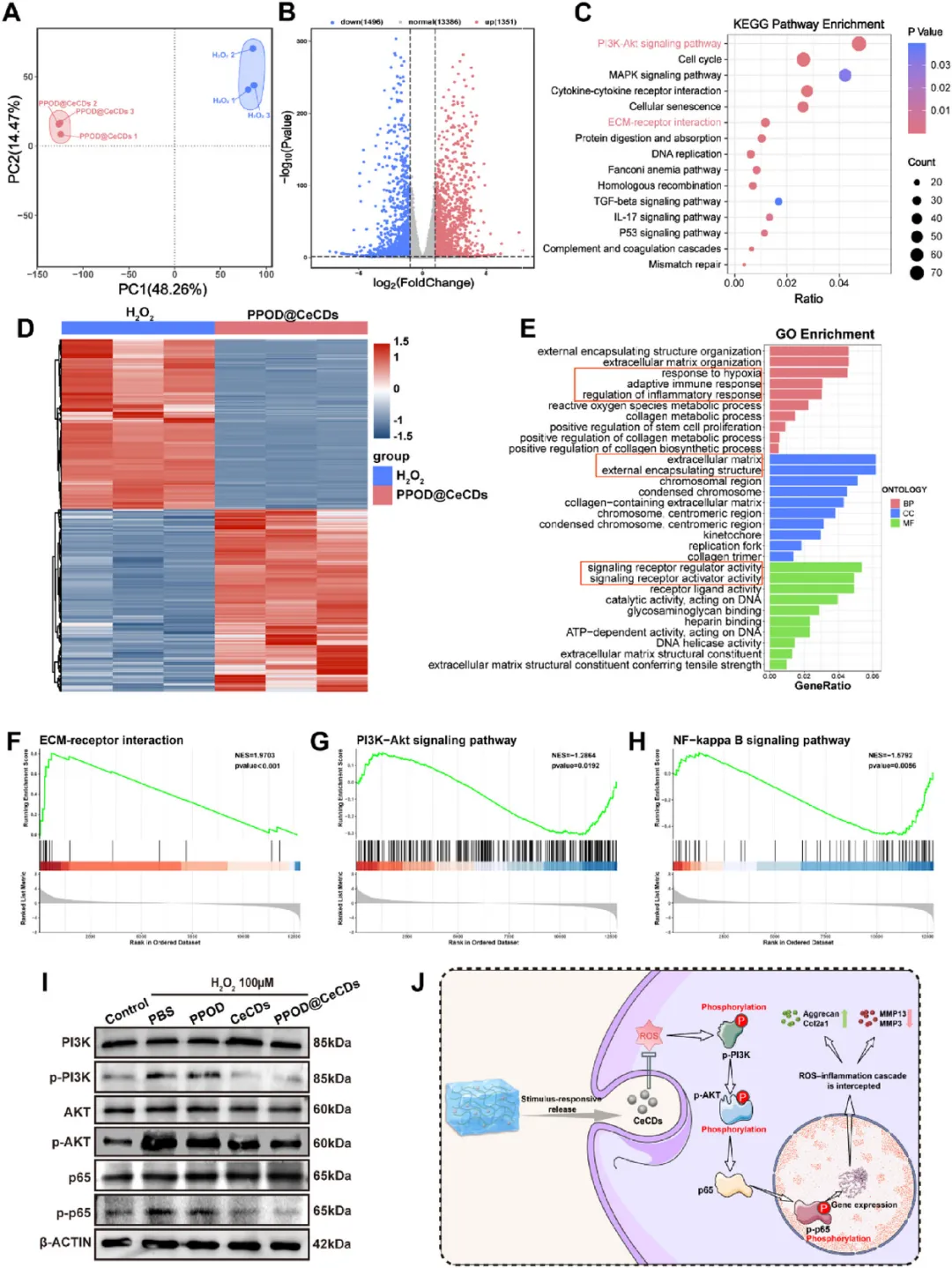 转录组分析与机制验证 PCA和差异表达分析显示,PPOD@CeCDs可驱动退变NP细胞系统性转录重编程,共鉴定出2847个差异基因;KEGG和GSEA分析表明其主要调控PI3K-Akt、NF-κB等信号通路;Western blot证实,其可显著抑制PI3K、AKT、p65的异常磷酸化,阻断ROS介导的炎症信号传导。