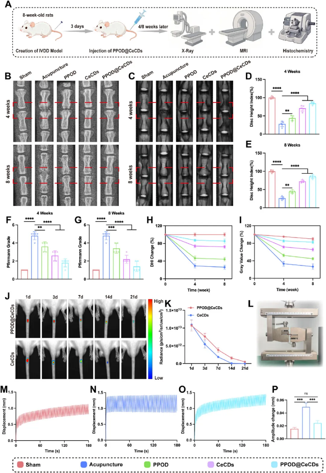 体内治疗效果 大鼠尾椎穿刺IVDD模型中,PPOD@CeCDs处理后4周和8周,椎间盘高度指数(DHI%)接近假手术组,T2-MRI信号显著高于其他治疗组;体内荧光成像显示,其在椎间盘内可稳定保留21天,而游离CeCDs 14天即基本清除;生物力学测试表明,其可有效恢复椎间盘剪切强度和抗疲劳性能,接近正常水平。