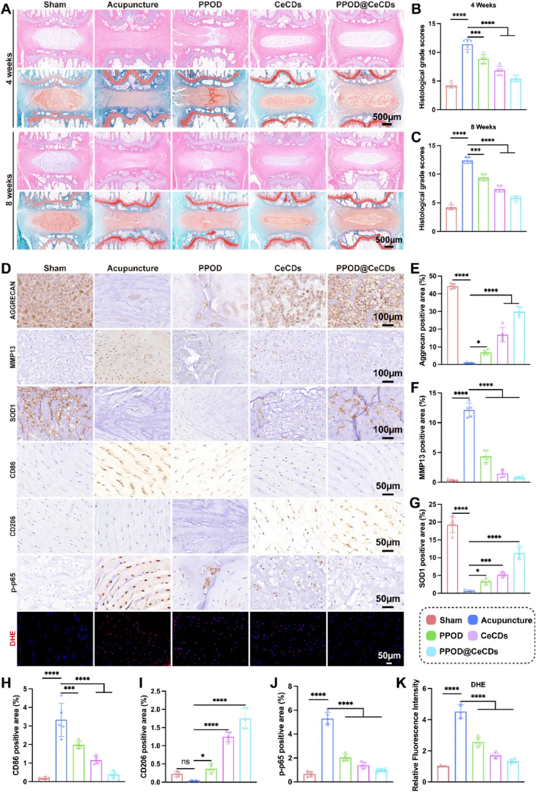 体内组织学验证 组织染色显示,PPOD@CeCDs可显著保留NP结构和蛋白聚糖含量,改善AF排列紊乱;免疫组化证实,其可提升Aggrecan、SOD1表达,降低MMP13、CD86、p-p65水平,增加CD206阳性区域,显著降低椎间盘内ROS水平;主要脏器无病理损伤,血清生化指标正常,生物安全性良好。