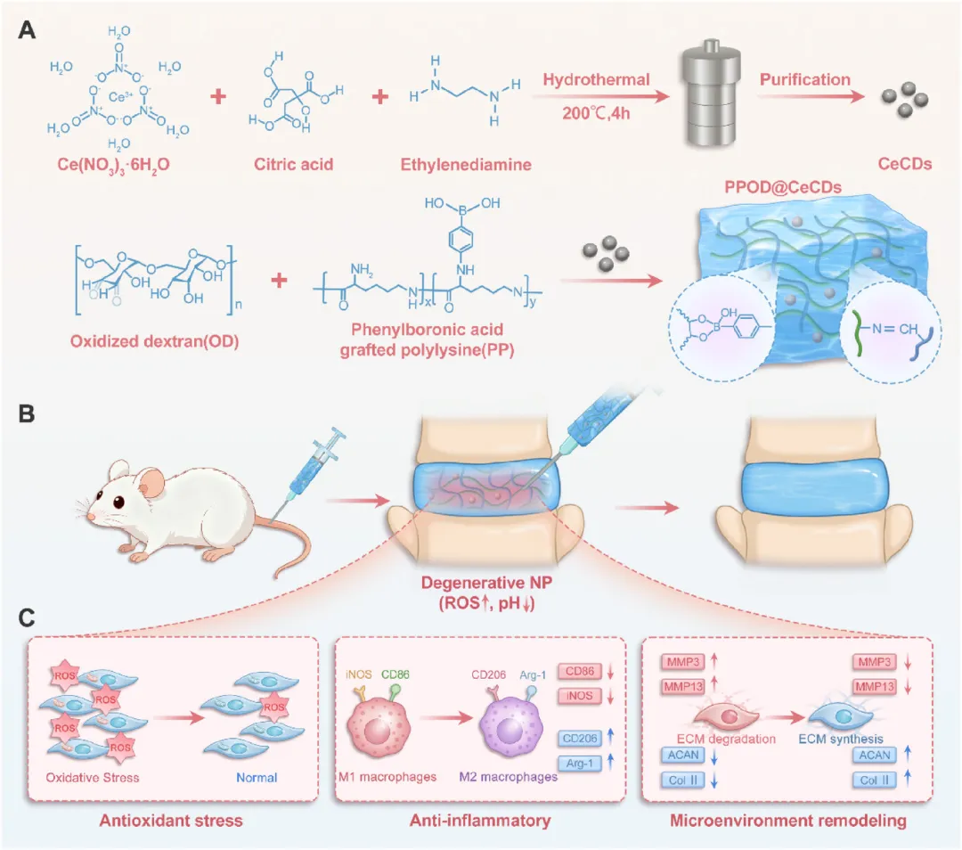 椎间盘退变(IVDD)是下腰痛的主要病理基础,活性氧(ROS)过度积累引发的氧化应激-炎症级联反应是其核心致病机制。现有干预手段难以实现退变微环境靶向滞留与持续ROS清除。南昌大学医学院第二附属医院程细高研究团队构建PPOD@CeCDs响应型平台,通过动态共价水凝胶实现CeCDs稳定释放,精准拦截ROS炎症级联,为IVDD治疗提供新策略。相关成果以"A Pathological Microenvironment–Responsive Catalytic Carbon Nanodots Release Platform Intercepting the ROS–Inflammation Cascade to Alleviate Intervertebral Disc Degeneration"为题发表在Advanced Healthcare Materials上。