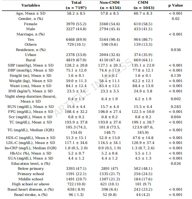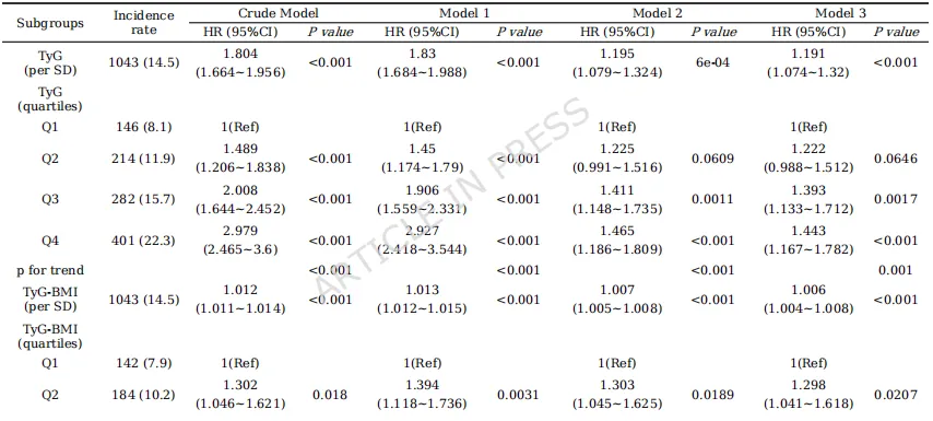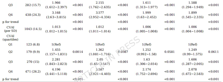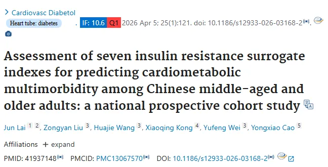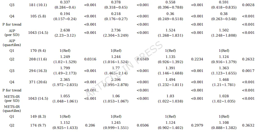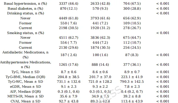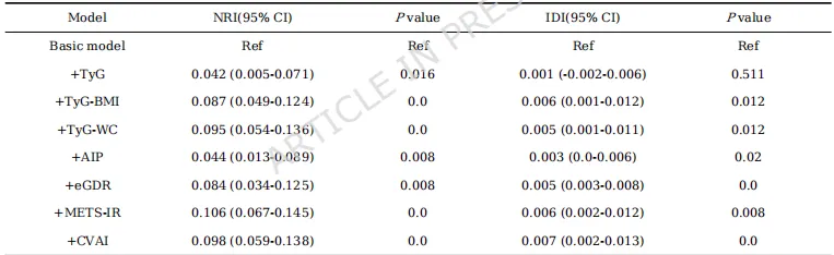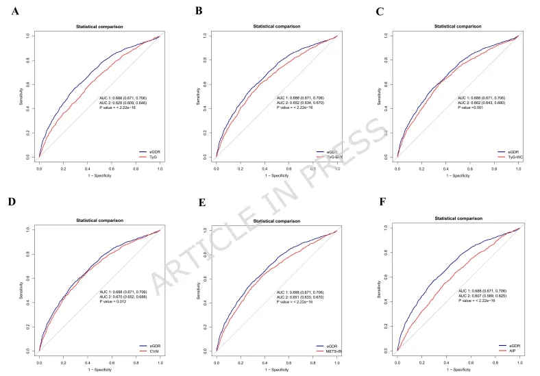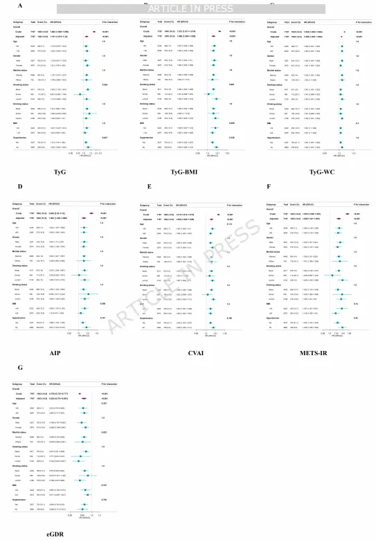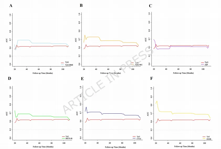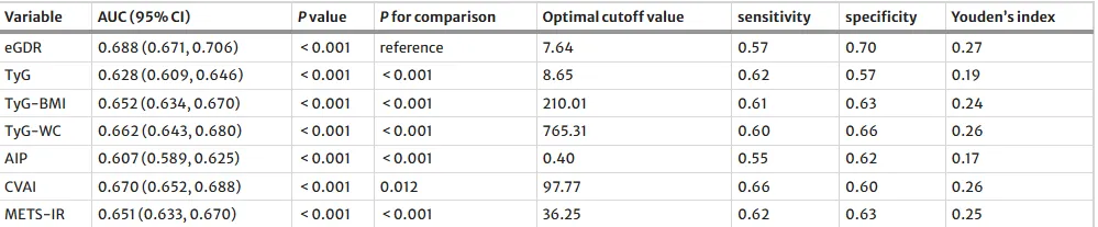 1.头对头比较:首次在同一大规模中国中老年队列中,系统比较了7种常用胰岛素抵抗替代指标(TyG, TyG-BMI, TyG-WC, CVAI, METS-IR, AIP, eGDR)对CMM的预测能力。