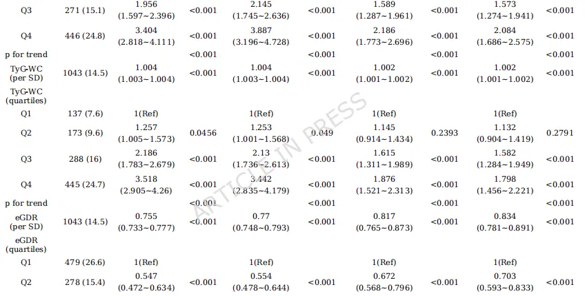 4.揭示非线性关系:首次报道eGDR与CMM风险呈“L型”关联,即风险随eGDR升高而下降,但在超过11.82后获益不再显著增加;而TyG-WC呈“U型”关联。