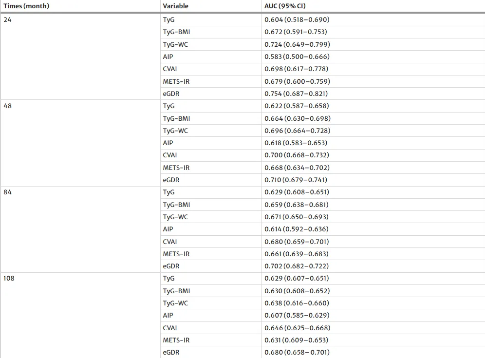 2.确定最优指标:明确发现eGDR(估算葡萄糖处置率)的预测效能最佳,且在不同随访时间点均保持稳定。