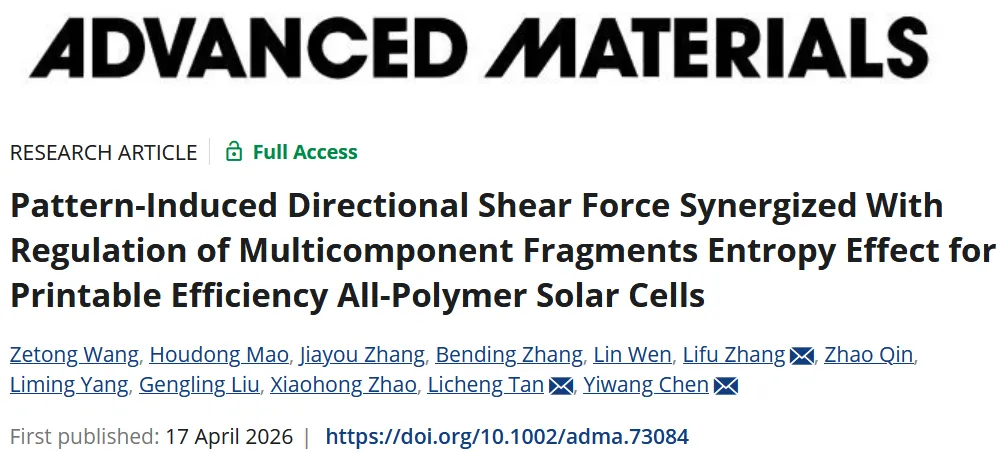 2026年4月17日,南昌大学陈义旺教授、谈利承教授、江西师范大学张立福教授及合作者在《Advanced Materials》上发表题为“Pattern-Induced Directional Shear Force Synergized With Regulation of Multicomponent Fragments Entropy Effect for Printable Efficiency All-Polymer Solar Cells”的研究论文。该工作首次提出了图案化刮涂协同多组分碎片熵效应调控的策略,用于构建伪平面异质结(PPHJ)全聚合物太阳能电池。图案化刮刀通过限域墨水流动增强定向剪切能力,有效引导聚合物链拉伸和有序堆积;同时,引入具有良好堆积取向的第三组分PTQ10,与PM6碎片结合,抑制了蒸发过程中熵驱动的链回缩效应,减轻了PM6的过度聚集,从而形成了理想的垂直梯度分布和双纤维网络形貌。