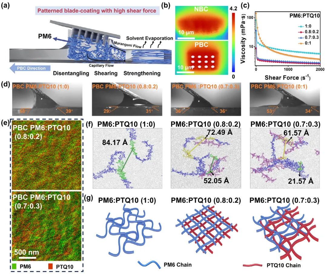 图案化刮涂的流体动力学模拟显示,与普通刮涂相比,图案化刮刀能够使流体在受限空间内挤出,增强定向剪切能力,使马兰戈尼流和毛细管流沿印刷方向协同竞争,从而实现聚合物碎片的有效拉伸和有序堆积。大面积薄膜的UV-vis吸收光谱 mapping证实,PBC薄膜具有优异的均匀性。流变学测试表明,引入PTQ10后溶液粘度降低,剪切极限下降,使溶质在较小剪切力下即可发生滑移。高速相机图像显示,PM6:PTQ10(0.8:0.2)溶液具有更小的弯月面接触角,表明PTQ10有效降低了溶液剪切极限,有利于聚合物链充分拉伸。