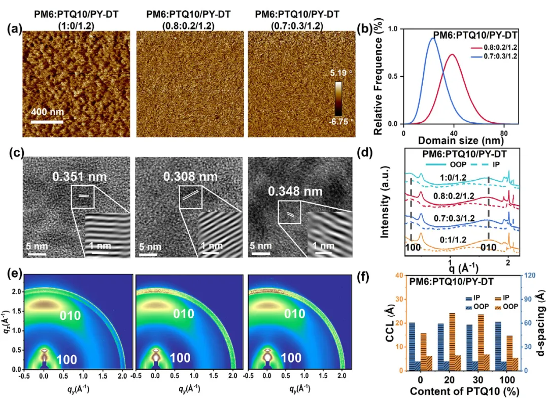 形貌表征方面,AFM相图和纤维尺寸分布显示,PM6:PTQ10/PY-DT(0.8:0.2/1.2)薄膜呈现明显的纤维状结晶,纤维尺寸集中在40 nm,而PM6:PTQ10/PY-DT(0.7:0.3/1.2)薄膜仅20 nm。HR-TEM晶格条纹显示,优化薄膜的面间距为0.308 nm,小于二元薄膜(0.351 nm)和过量掺杂薄膜(0.348 nm),表明晶体取向和连续性更优。GIWAXS结果表明,优化薄膜在面内方向(100)层状堆积峰更强,在面外方向(010)π-π堆积峰更强,呈现优先的面-on取向;层状堆积距离和π-π堆积距离均最小,结晶相干长度达72.5 Å,显著大于二元膜的47.4 Å,表明结晶性显著增强。