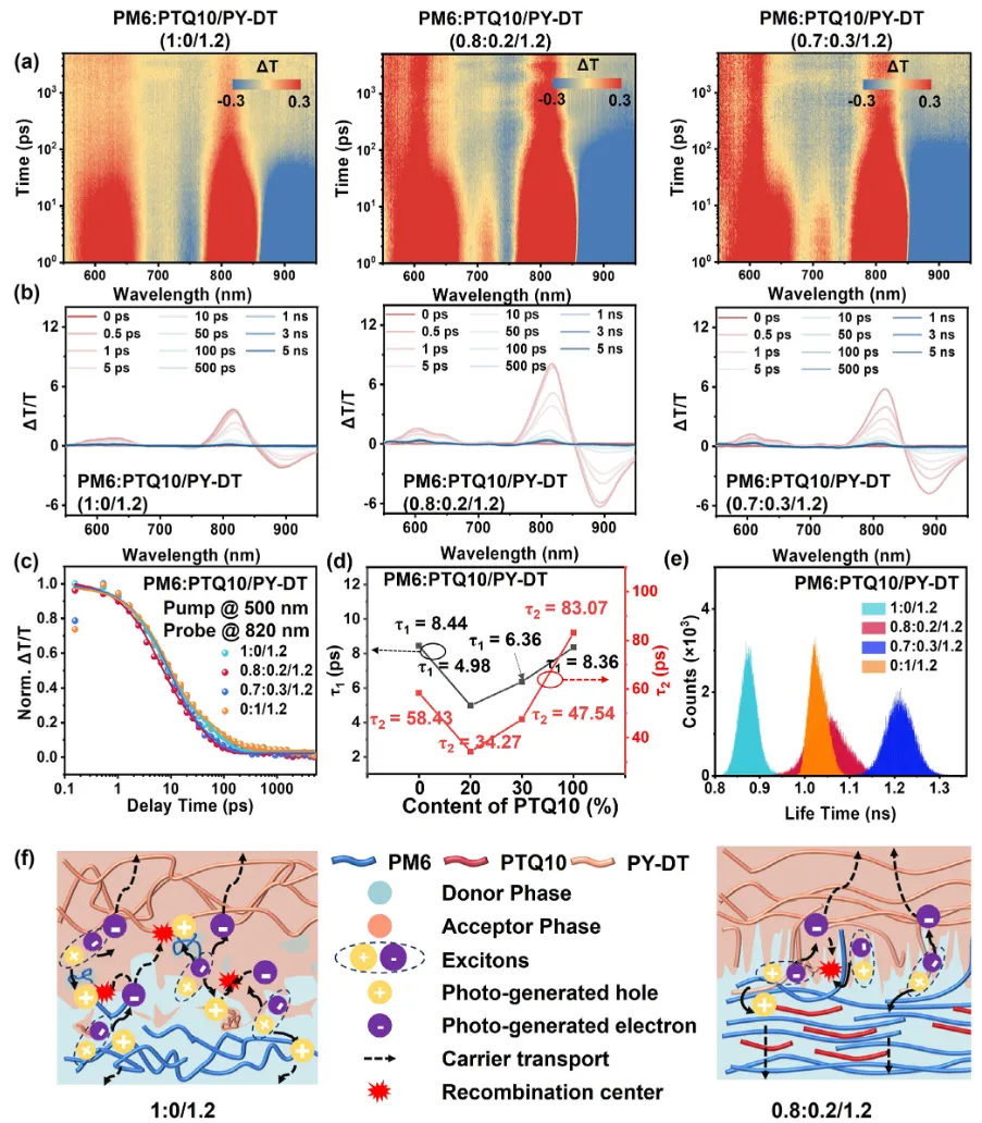 通过瞬态吸收光谱测试了激子动力学。在500 nm泵浦激发下,PTQ10掺杂薄膜在720 nm处出现明显的基态漂白信号,证明PTQ10被激发,提供更多空穴位点加速电子转移。PM6:PTQ10/PY-DT(0.8:0.2/1.2)薄膜在820 nm处的TA信号衰减最快,双指数拟合显示超快激子解离时间(τ₁)和扩散限制电子传输时间(τ₂)均最短,说明激子解离和电子转移速率显著增强。荧光寿命成像显示,三元薄膜具有更强的PL猝灭效率和更长的PL寿命,优化了激子迁移行为。