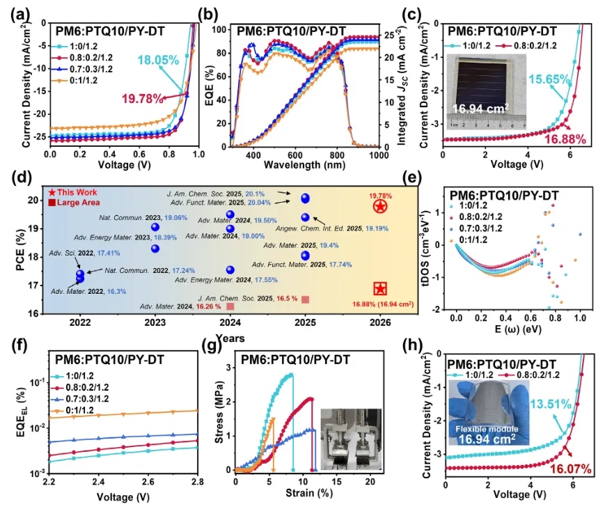 3、器件效率达19.78%(填充因子79.76%),16.94 cm²柔性模块效率16.88%,柔性器件效率18.92%,为全聚合物太阳能电池大面积印刷提供了可靠路径。