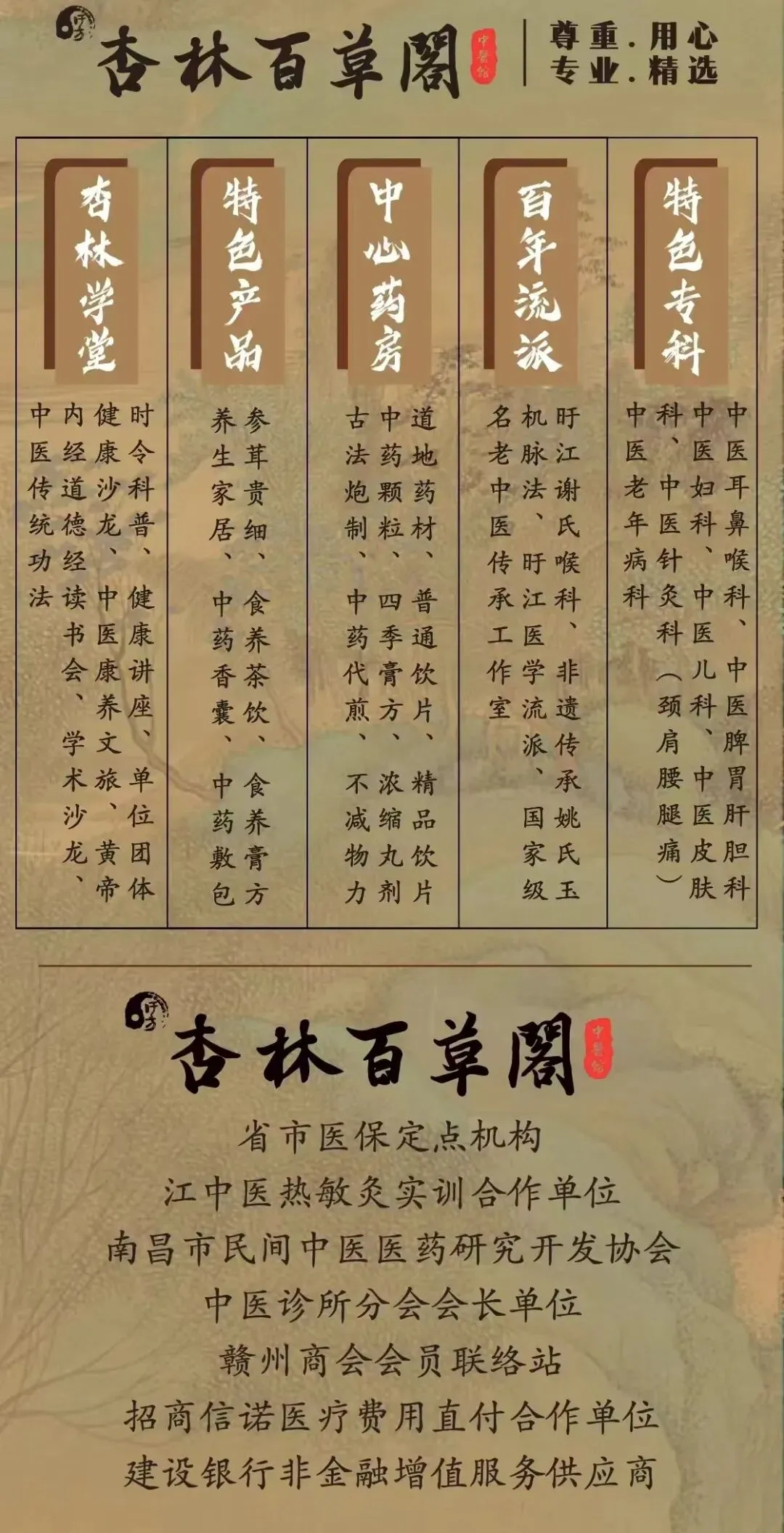 杏林百草阁中医馆是南昌杏林百草阁中医门诊有限公司在南昌市红谷滩新区首家设立的以传统中医为本,以现代新中式风格为基调的综合性一站式专业中医诊疗服务机构。经省市医疗保障局审批通过,为省市医保定点单位。医馆自2018年10月开馆以来,始终奉行“良医好药,医者仁心,医德为先”的经营理念,把“尊重 用心 专业 精选”作为医馆全员的核心价值观,把传承中医药经典文化,弘扬杏林精神,创造健康美好生活作为医馆的长远使命。恪守“治病救人勿以私,商道兴业务以德”的馆训,致力于成为省内首选、国内知名的中医诊疗、中医康养、中医教育的一站式医养服务平台。