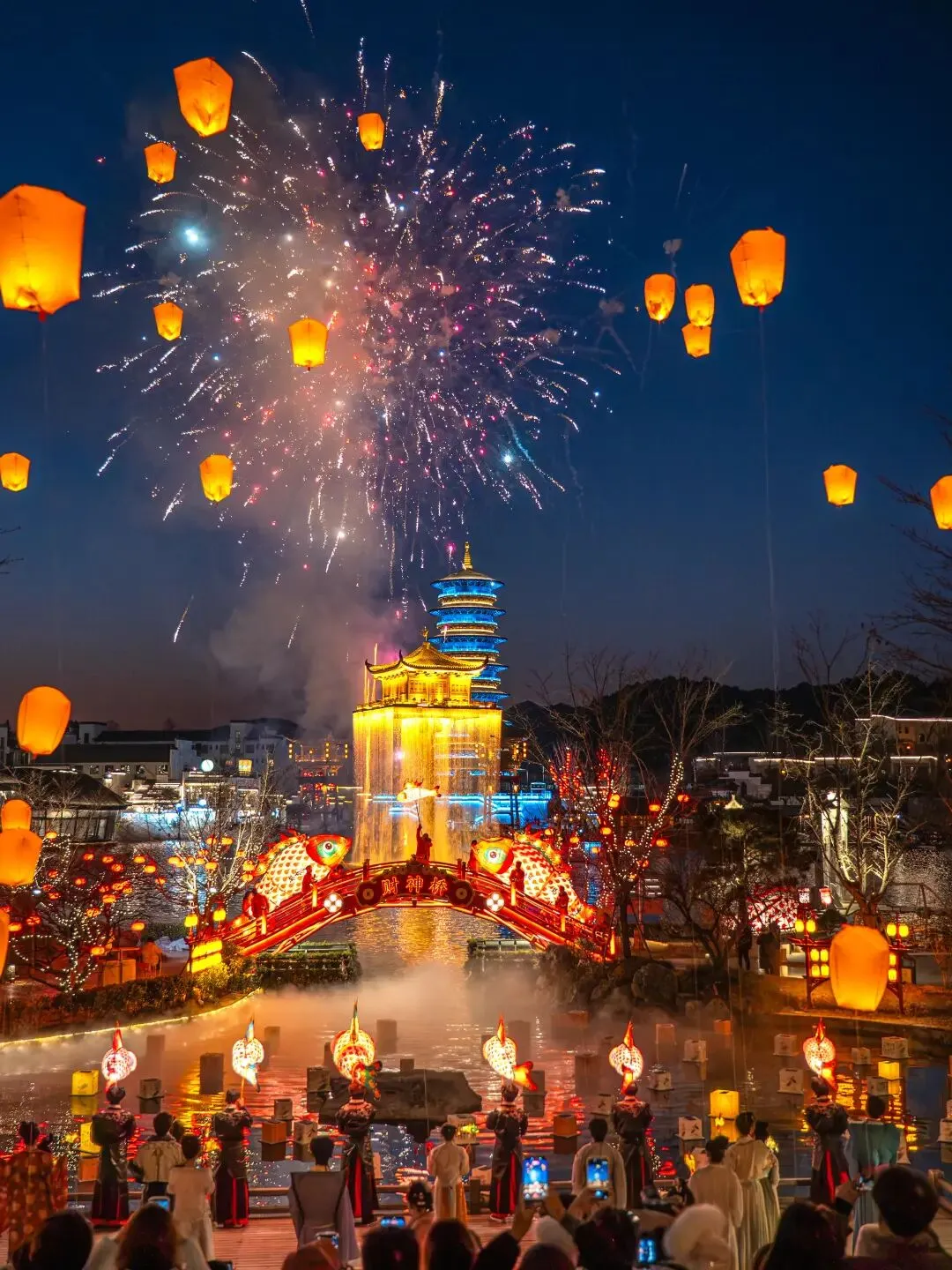 下午打卡【弦高城】,古城由西湖凼街区和天上堂景区两个部分组成。西湖凼街区已对外开放,前身为南宋时期的“婺源西湖”,是集徽州文化、市井生活、山水意境与现代创意体验于一体的文商旅综合体,有璧月门、垂花楼、程家大院,型尖角等景点。游玩项目:有赛博醒狮、《市郎图》巡游、非遗灯彩巡游等表演,还可以体验甲路伞绘画、徽墨描金等手作,晚上19:00后可以欣赏夜游星江的灯光秀和城墙投影,参与 NPC 互动。