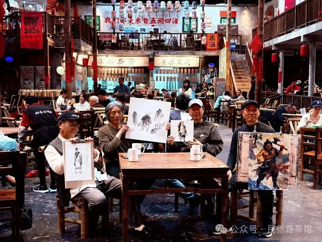 复刻《水浒传》经典茶坊场景,摆放仿古木桌、藤椅、酒坛、茶碗等道具,摆放原著、精校版、青少版、连环画等不同版本的水浒故事及相关解读图书。