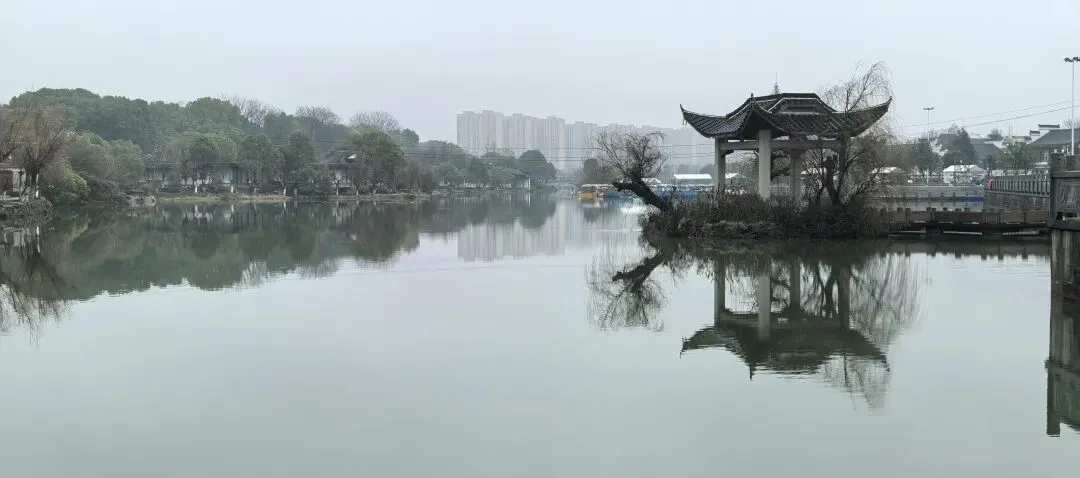 青云谱是一个道观,亭台楼阁,绿树掩映,观前有湖,湖水相映,虽是阴雨天气,倒是有几分静谧。湖中有石铺平桥,可以达青云谱。