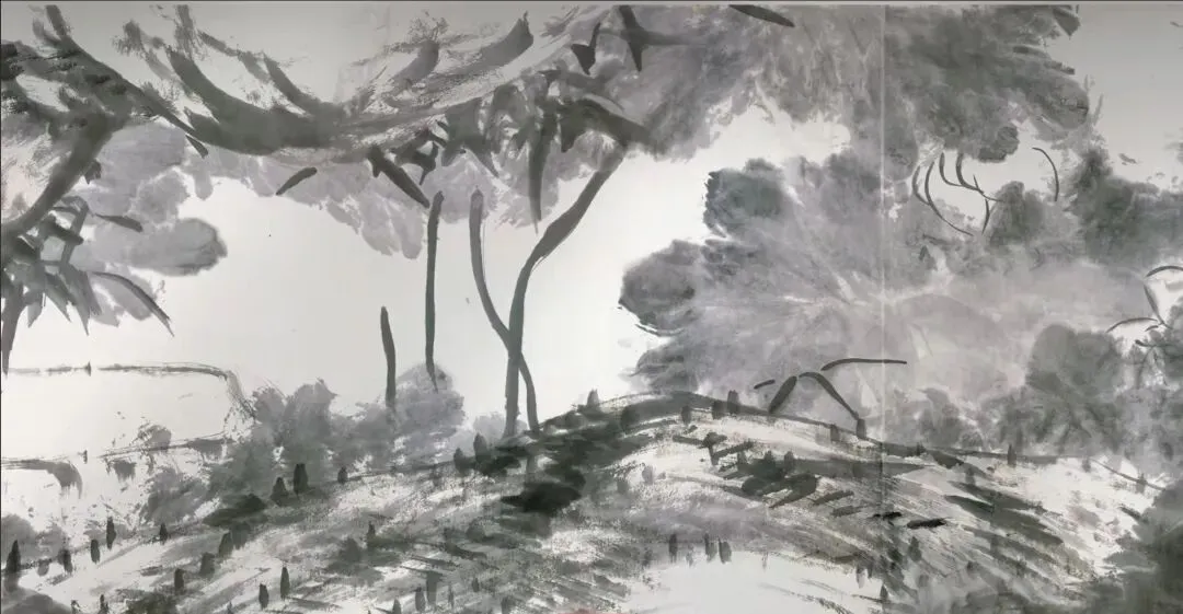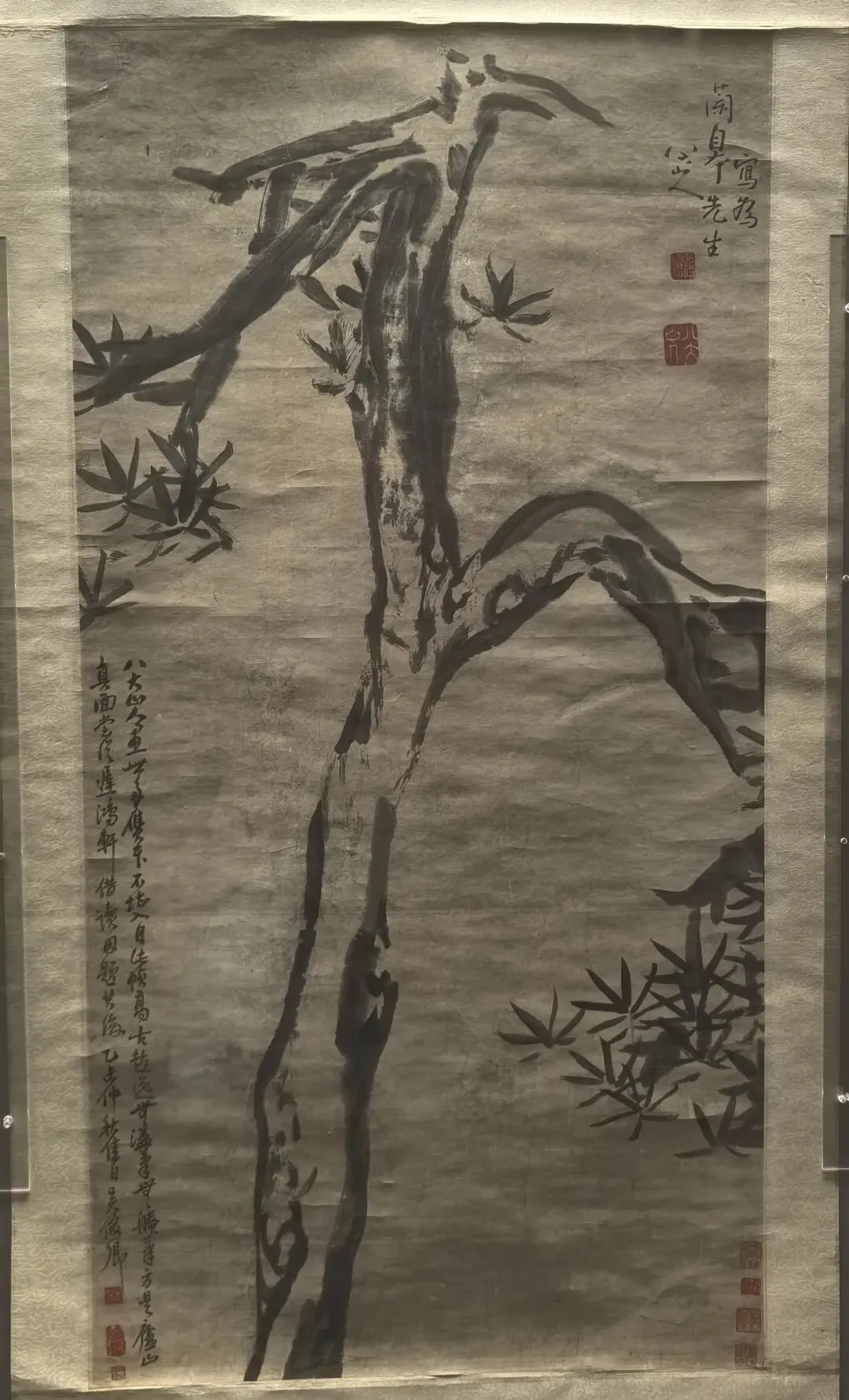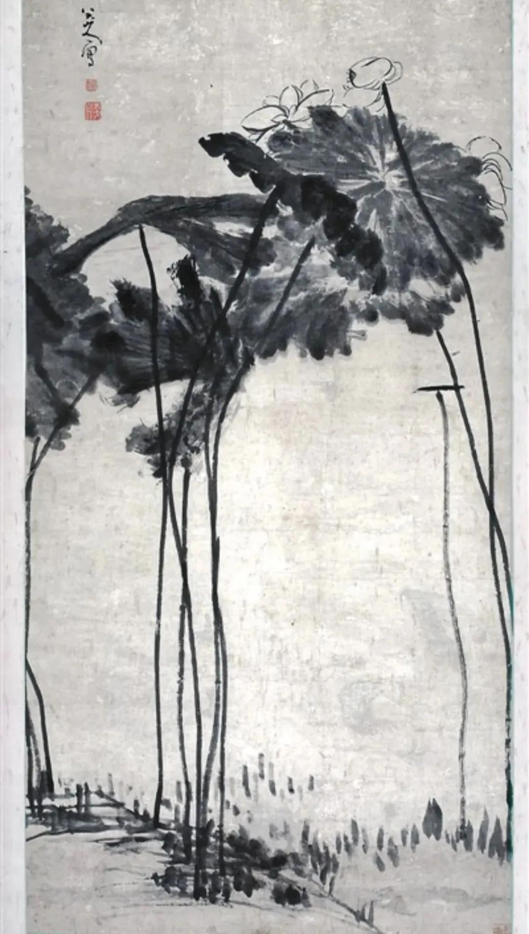 转过几个庭院,不知不觉中转入一间厅堂,忽而墙上的一副《河上花图》长卷直入眼帘,一种特别的感觉扑面而来,那荷叶、山石、兰草、枯树、流水徐徐展开。那线条、泼墨、墨点、笔皴、墨色肆意洒脱。那笔墨犹如舞者在空白的宣纸上起舞,时而激越,时而舒缓,时而高亢,时而低吟,时而密如骤雨,时而疏如晨星。再看那枯树、残荷、幽草仿佛又是一种密语,诉说着只可意会不可言传的话语。