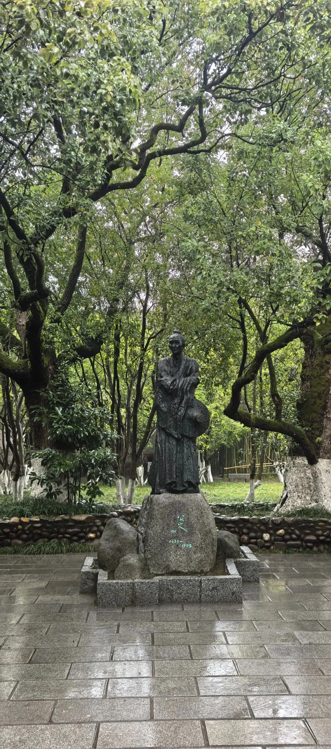 走出真迹馆,雨一下大了起来,天色黯淡,风雨飘摇。回首那馆里展览的幅幅作品,仿佛没有看到一副浓墨重彩的,挥笔皆为墨色,犹如那一刻抬头的天空,有乌云翻卷,有天际透白,连那绿树古建也成了灰黑墨色的点缀。