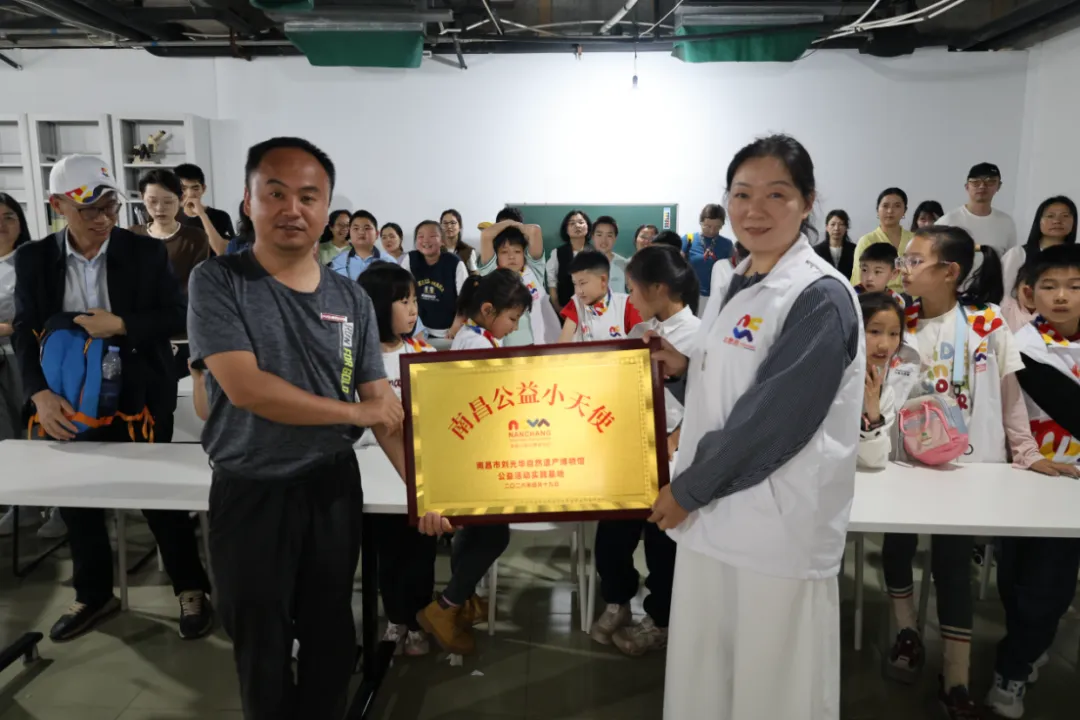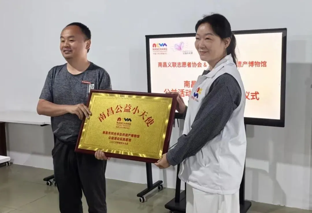 签约后,曾文莉代表南昌义联志愿者协会为刘光华自然遗产博物馆授予“公益活动实践基地”牌匾。