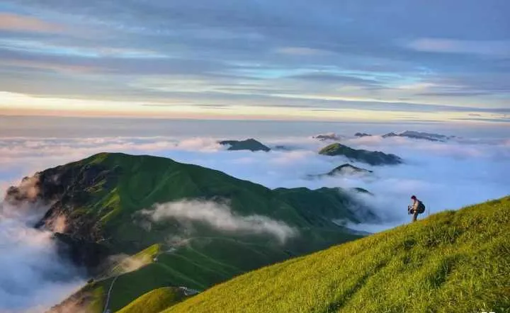 金顶的草甸是武功山的招牌,绿油油一大片铺在山顶上,风吹过去草浪翻滚,躺在上面仰望天空,你会觉得自己跟这片草甸融为一体了,那种放松不是刻意营造出来的,是真的放松,因为在武功山,你不需要证明什么,不需要打卡什么,你只需要在这儿待着就够了。