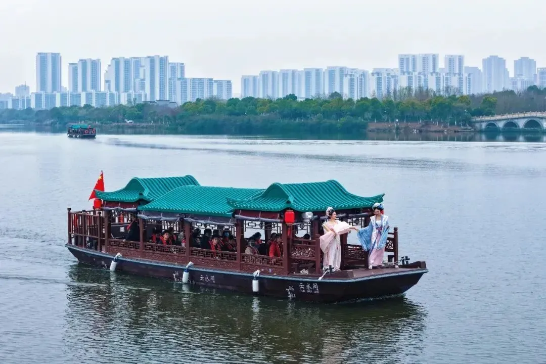 为迎接此次盛会,象湖游船项目已准备就绪。景区内拥有“知行舟”“云水间”“文渊舫”等文化主题画舫,这些画舫设计典雅,内部陈设古朴。航线串联起了章江晓渡、天鼋风荷、西堤烟景、豫章书院等十余处景点。