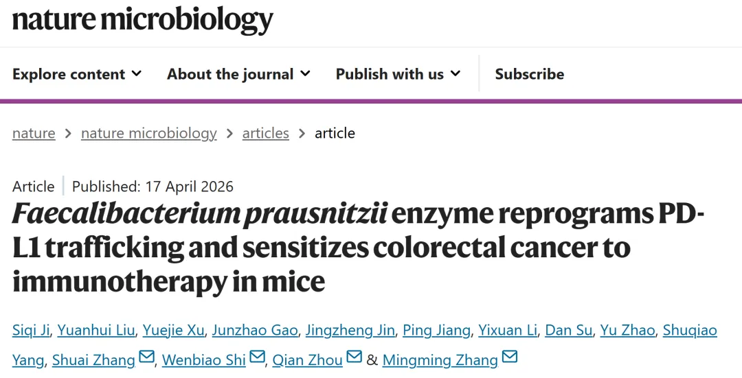 BioArt:2026年4月17日,上海交通大学医学院附属仁济医院消化科张明明团队于Nature Microbiology期刊上发表题为Faecalibacterium prausnitzii enzyme reprograms PD-L1 trafficking and sensitizes colorectal cancer to immunotherapy in mice 的研究论文。首次从普拉梭菌中鉴定出一种全新活性蛋白fpPRPS,可通过调控宿主细胞ATP代谢抑制结直肠炎癌转化并增强免疫治疗疗效。