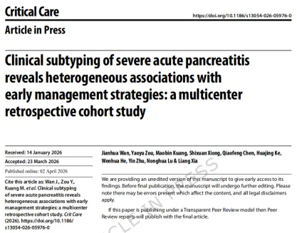 南昌大学第一附属医院新闻中心:近日,南大一附院消化内科胰腺团队联合国内外多中心研究力量,在国际重症医学权威期刊Critical Care(中科院一区 Top 期刊,IF:9.3)发表题为 “Clinical subtyping of severe acute pancreatitis reveals heterogeneous associations with early management strategies”的研究成果。该研究首次在国际上明确并验证了重症急性胰腺炎的三种稳定临床亚型,揭示了不同亚型与核心治疗方案的个体化关联,为重症急性胰腺炎的精准诊疗提供了全新理论依据与临床工具,推动该领域从 “经验治疗” 迈向 “分型施治” 的精准医学新阶段。