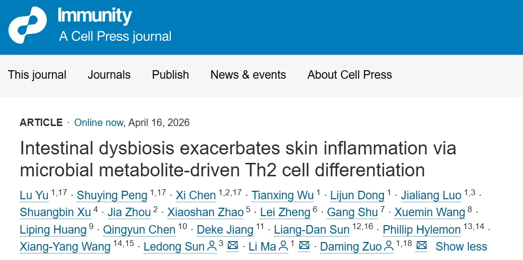 BioArt:2026年4月16日,南方医科大学左大明、马骊、孙乐栋等团队在《免疫》(Immunity)发表研究,揭示“肠-皮轴”新机制:肠道上皮TLR4缺失导致菌群失调,通过胆碱代谢产物TMAO驱动Th2细胞分化,加剧特应性皮炎(AD)。