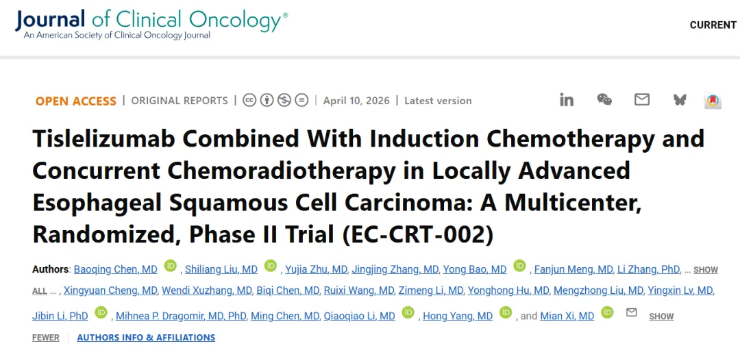 医学新视点:食管鳞状细胞癌(ESCC)是一种高度侵袭性恶性肿瘤。近日,EC-CRT-002研究结果发表于《临床肿瘤学杂志》(Journal of Clinical Oncology),表明诱导化疗联合同步放化疗,以及替雷利珠单抗免疫治疗(无需维持治疗)的策略,在治疗局部晚期ESCC中显示出令人满意的疗效和可控的安全性特征。该研究通讯作者为中山大学肿瘤防治中心习勉教授。