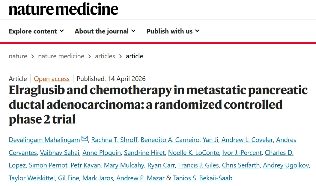 近日,《自然-医学》(Nature Medicine)发表的一项研究结果表明,elraglusib与单纯化疗(吉西他滨联合白蛋白结合型紫杉醇,GnP)联用,可显著延长转移性胰腺导管癌(mPDAC)患者的中位总生存期(OS),死亡风险降低38%。文章指出,基于本次研究积极结果数据,将规划规模更大的3期研究,以进一步明确elraglusib的疗效和安全性。