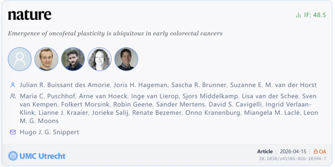 热心肠研究院:2026年4月15日,乌得勒支大学Hugo J G Snippert团队在《自然》(Nature)发表研究,揭示结直肠癌转移的种子在疾病早期就已种下,由微环境中的滋养细胞样癌相关成纤维细胞(CAF) 通过旁分泌信号驱动癌胚可塑性。