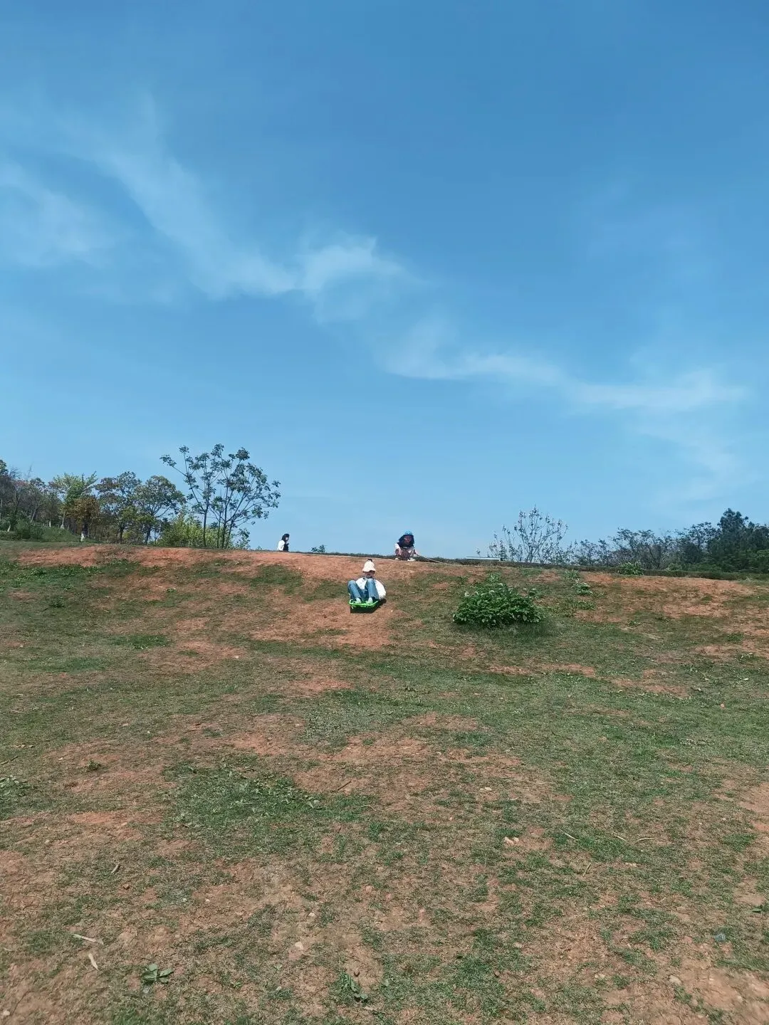山坡上有一片草坡,不是很高,但足够孩子们滑了。宝贝们冲下去,尖叫着,笑声在山谷里回荡。一个一个紧随其后,滑到一半歪了,滚了两圈,爬起来拍拍土,继续滑。小宝太小,不敢滑,就坐在坡顶看姐姐们,拍着手笑。