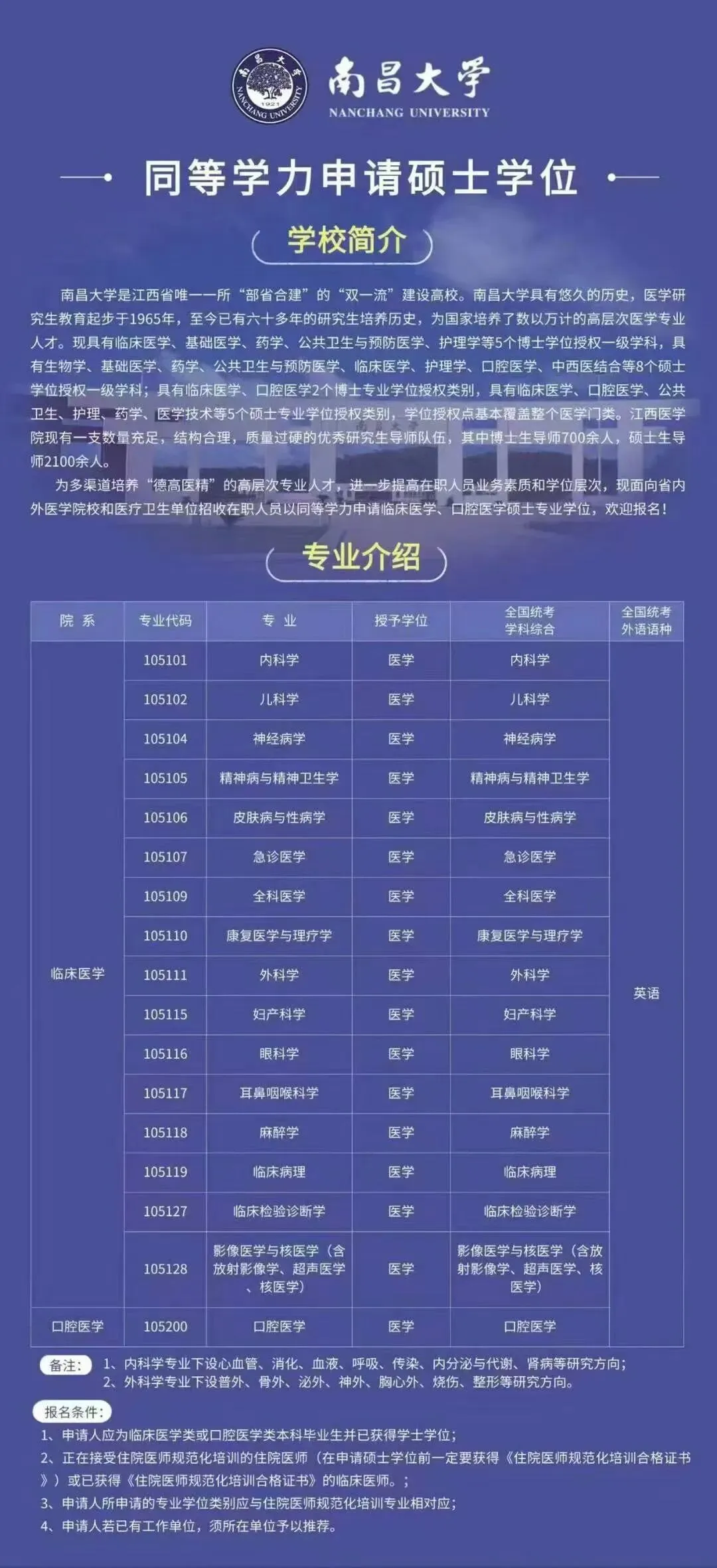 南昌大学在职硕士同等学力申硕最新招生简章,新增临床医学和口腔医学专硕