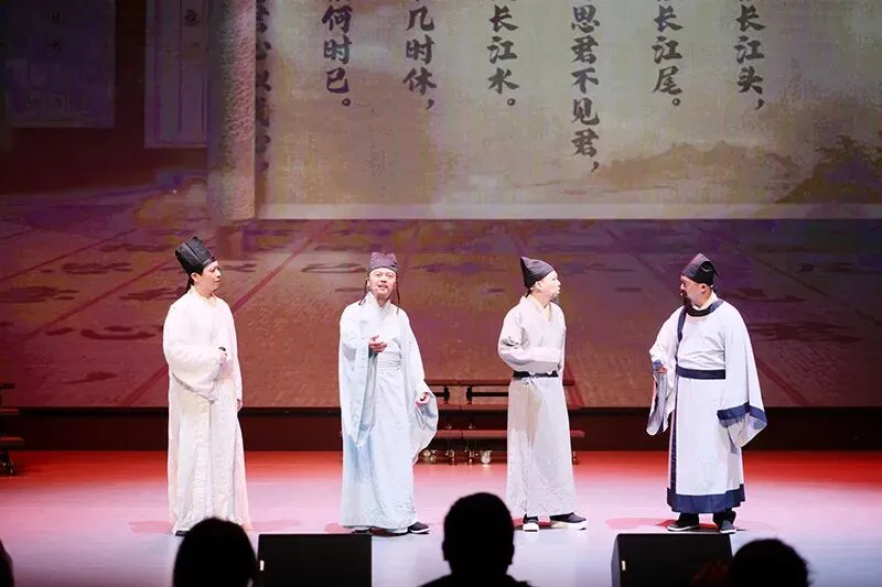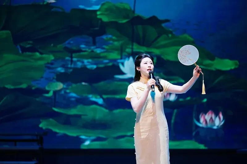 演出环节中,经典篇目轮番上演,情感层层递进、亮点纷呈。《诗词里的长江》以雄浑激昂的语调,勾勒出长江的壮阔与厚重,让观众在声音中感受中华大地的山河之美;《桃花源记》则以舒缓柔和的节奏,将世外桃源的安宁与美好娓娓道来,带领观众走进古典文学的诗意世界。现当代名篇演绎中,《再别康桥》的温柔婉转、《荷塘月色》的静谧悠远、《雨巷》的朦胧深情、《致橡树》的独立坚定、《河床》的磅礴气势、《月光下的中国》的深情礼赞,每一段朗诵都饱含真挚情感,让现场观众沉浸在文学的魅力之中,不时响起阵阵掌声。