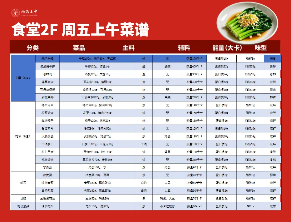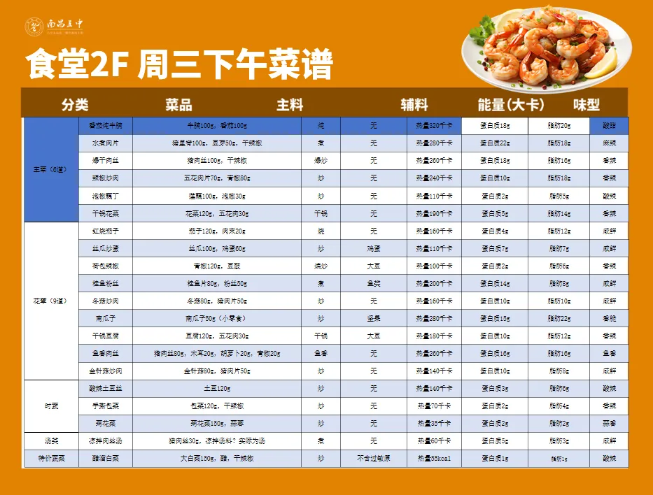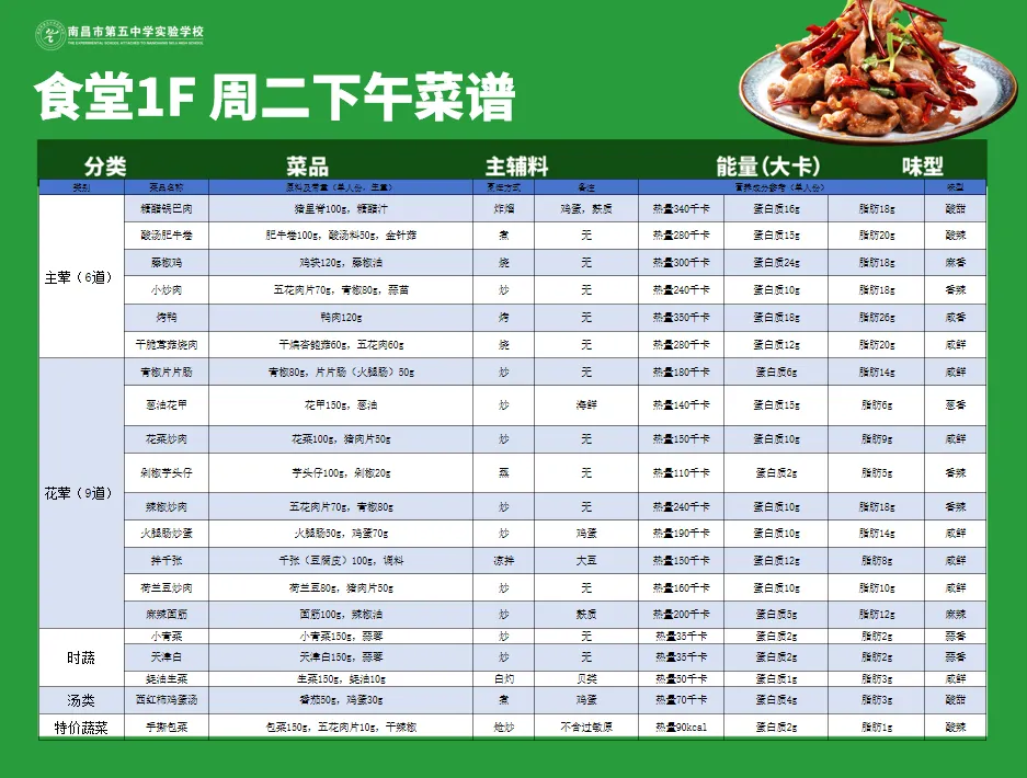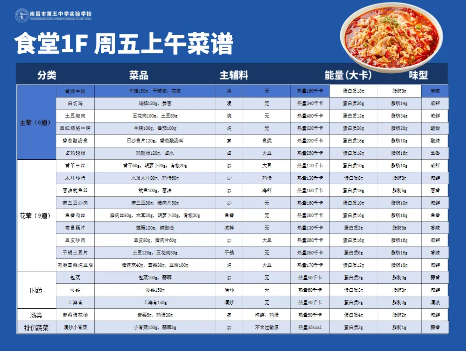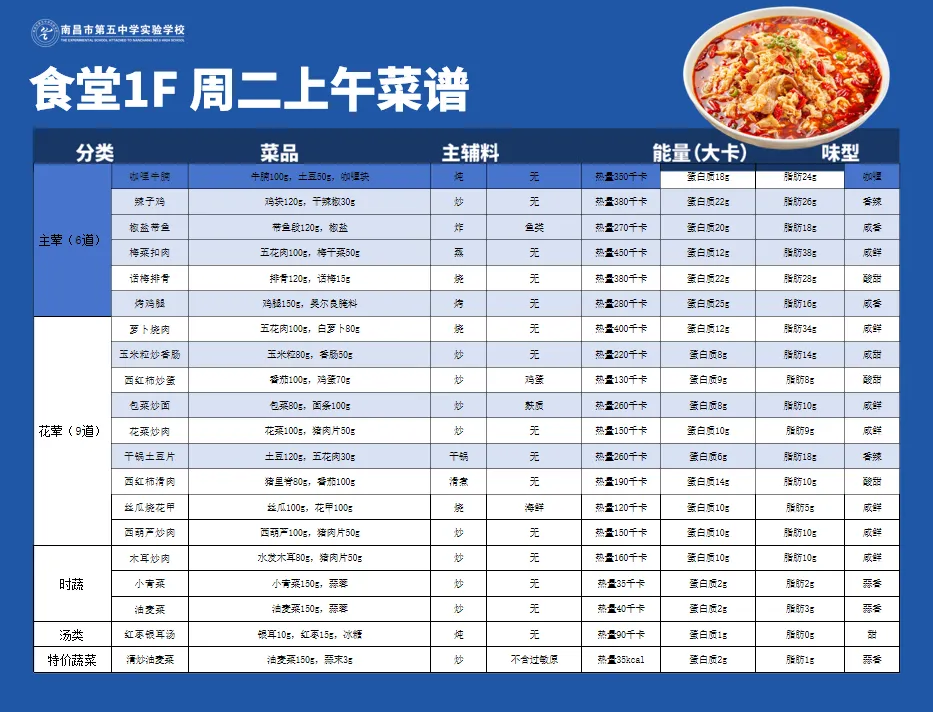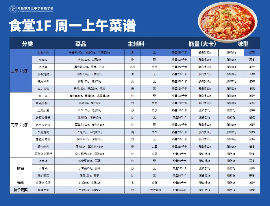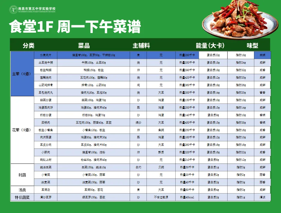 健康的饮食是学生成长的根基,日常的营养膳食是保证学生身心成长的关键基础。为提升师生膳食质量,守护师生“舌尖上的安全”,南昌五中后勤部门精心设计了兼顾营养与风味的美食菜单,多措并举,全方位保障师生享用的餐食安全、营养、美味。