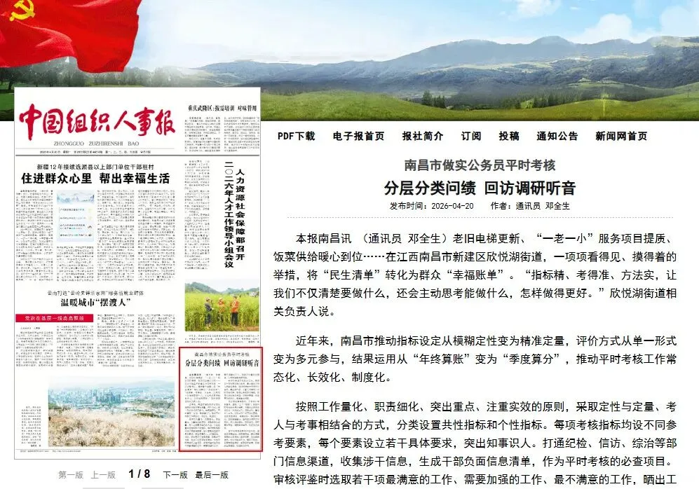 近年来,南昌市推动指标设定从模糊定性变为精准定量,评价方式从单一形式变为多元参与,结果运用从“年终算账”变为“季度算分”,推动平时考核工作常态化、长效化、制度化。