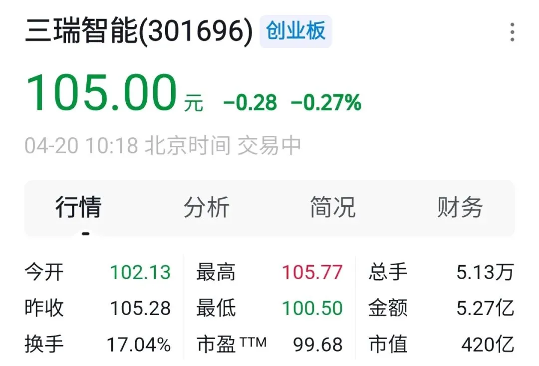 2026年4月10日上午9点半,深圳证券交易所的大屏幕上,一只代码为301696的股票开始跳动。开盘价90元,较24.68元的发行价跳涨264.67%。收盘时,涨幅定格在272.77%,总市值达到368亿元。这一天,南昌三瑞智能科技股份有限公司正式登陆创业板,成为中国“无人机动力系统第一股”。