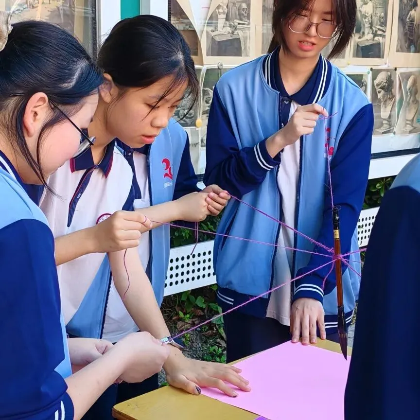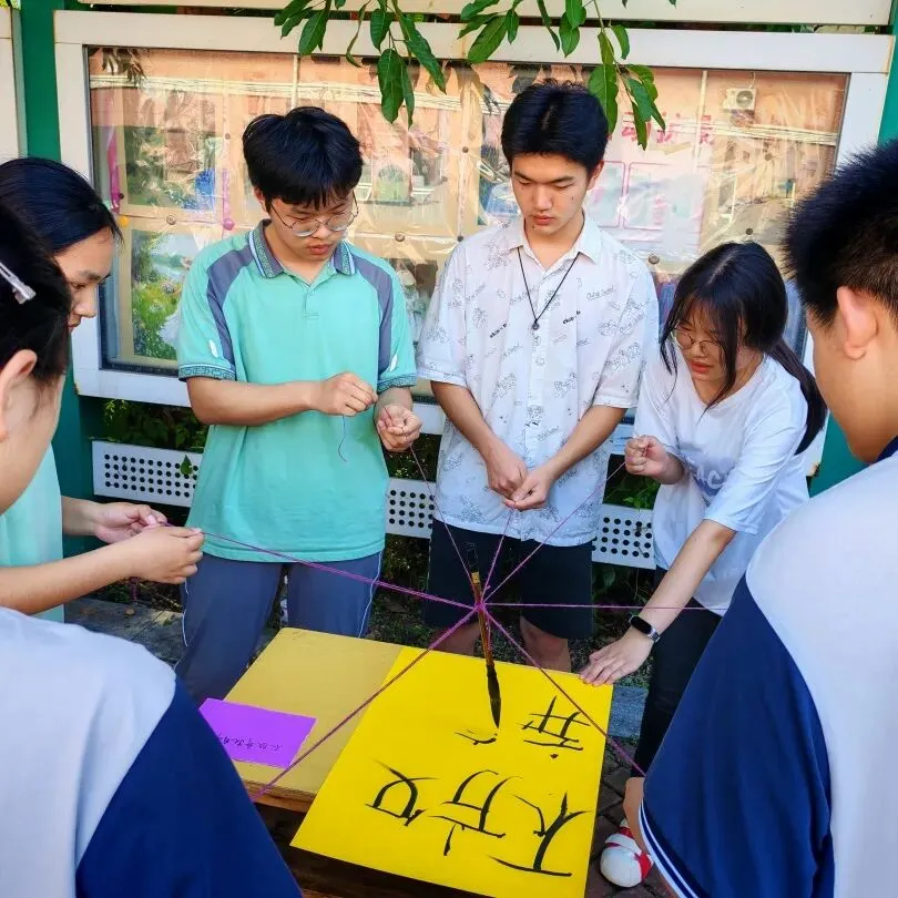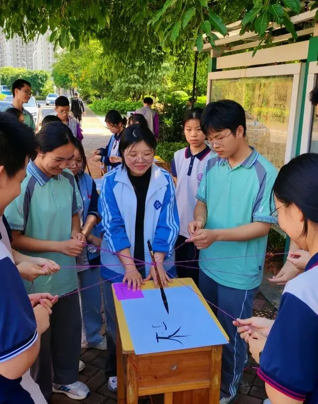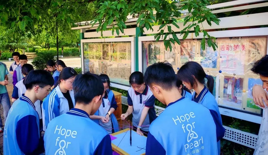 在刘健平学姐带领的马良神笔体验活动中,所有队员手拉着系在同一支画笔上的绳索,彼此配合、调整力度。没有争执,只有互相迁就;没有慌乱,只有协同发力,一笔一划共同写下“珍珠”二字,把同心聚力、彼此扶持的珍珠精神,尽数落在画布之上,也刻进每一个人的心里。