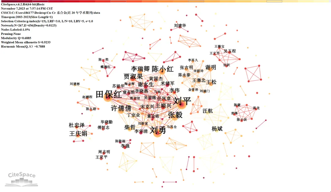 图2 Cu-Cr系合金核心发文作者共现网络知识图谱